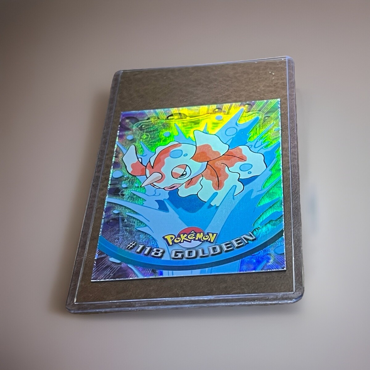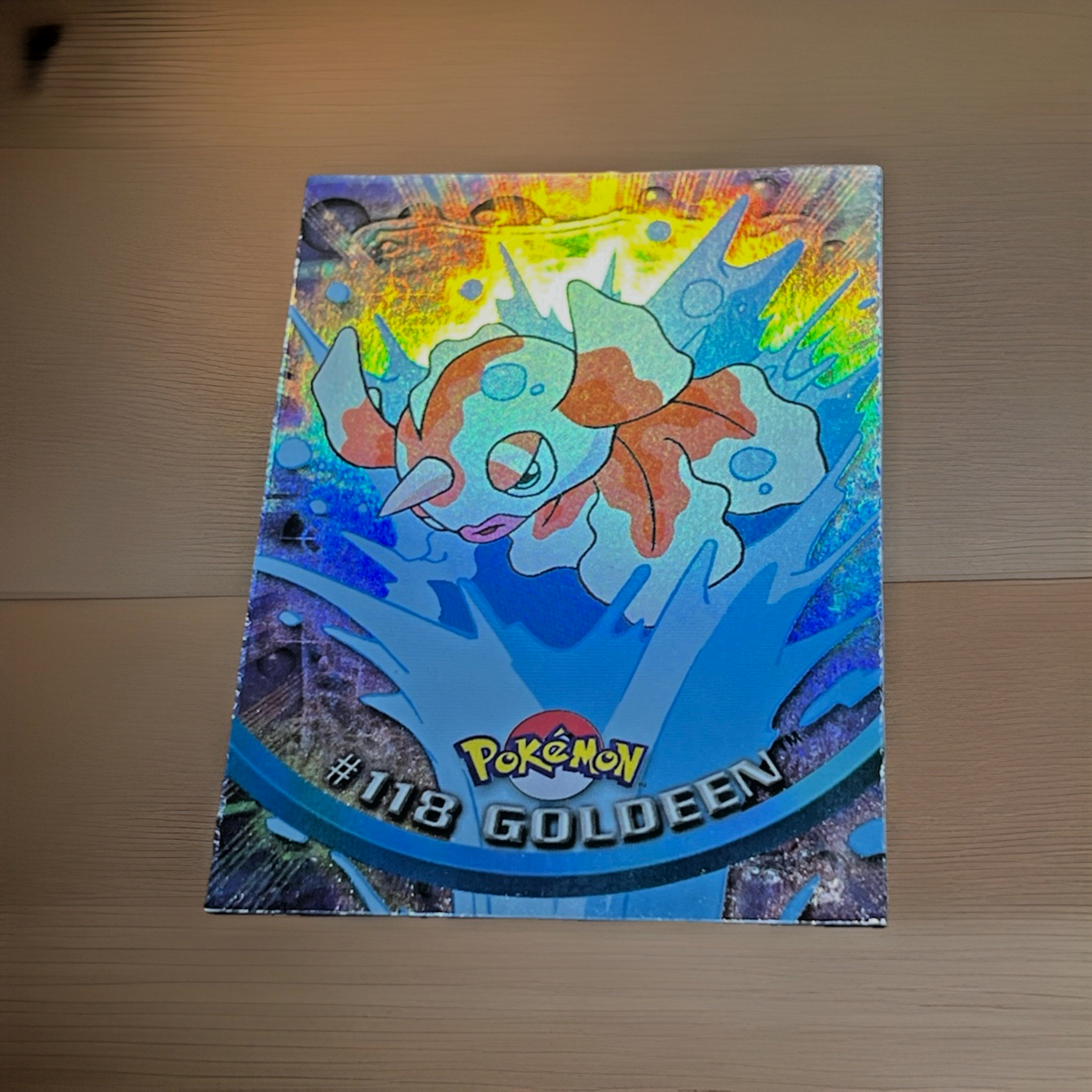 The product is a #118 Goldeen Rainbow Foil Topps TV Animation Series 3 Pokemon Card from 2000. This collectible card features the character Goldeen from the Pokemon TCG in English language. Manufactured by Topps, this speciality card has a rainbow foil finish, making it a unique and sought-after addition to any card collection.
