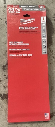 Maximize your band saw performance and make straight, accurate cuts in a variety of materials with the Milwaukee 10 TPI standard/deep-cut portable band saw blade. Get exceptional durability and accuracy for your portable band saw that takes a 44-7/8" blade. Milwaukee's standard/deep cut band saw blades deliver long tooth life in a variety of metal, including strut, conduit, angle iron, copper tube, threaded rod and pipe. The blade's tooth form, pitch and set ensure straight, accurate cuts time and time again.