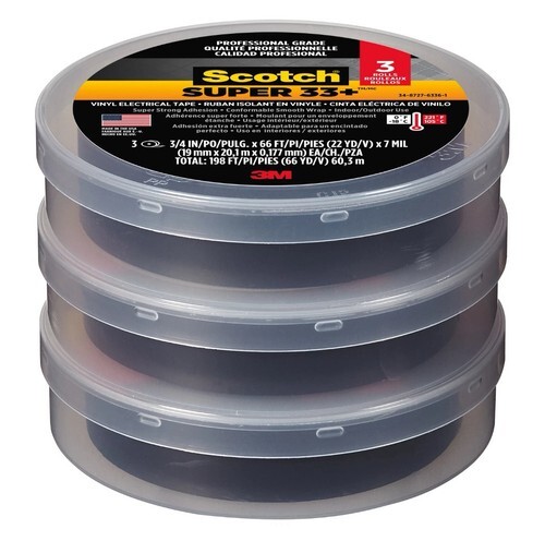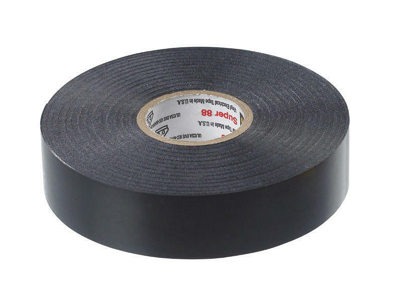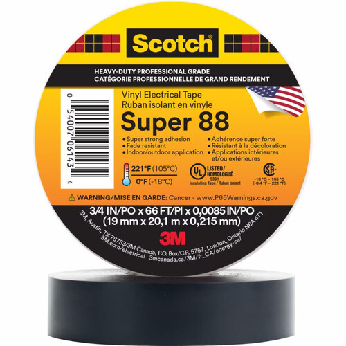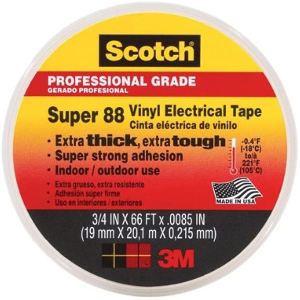 Scotch Vinyl Electrical Tape Super 88 is an 8.5-mil thick, premium grade all-weather vinyl insulating tape. It is designed to perform continuously in ambient temperatures up to 221F (105C). The tape is conformable for cold weather application down to 0F (-18C). It has excellent resistance to abrasion, moisture, alkalies, acids, corrosion and varying weather conditions (including UV exposure). The combination of an elastic PVC backing and aggressive pressure-sensitive rubber-based adhesive provides moisture-tight electrical and mechanical protection.