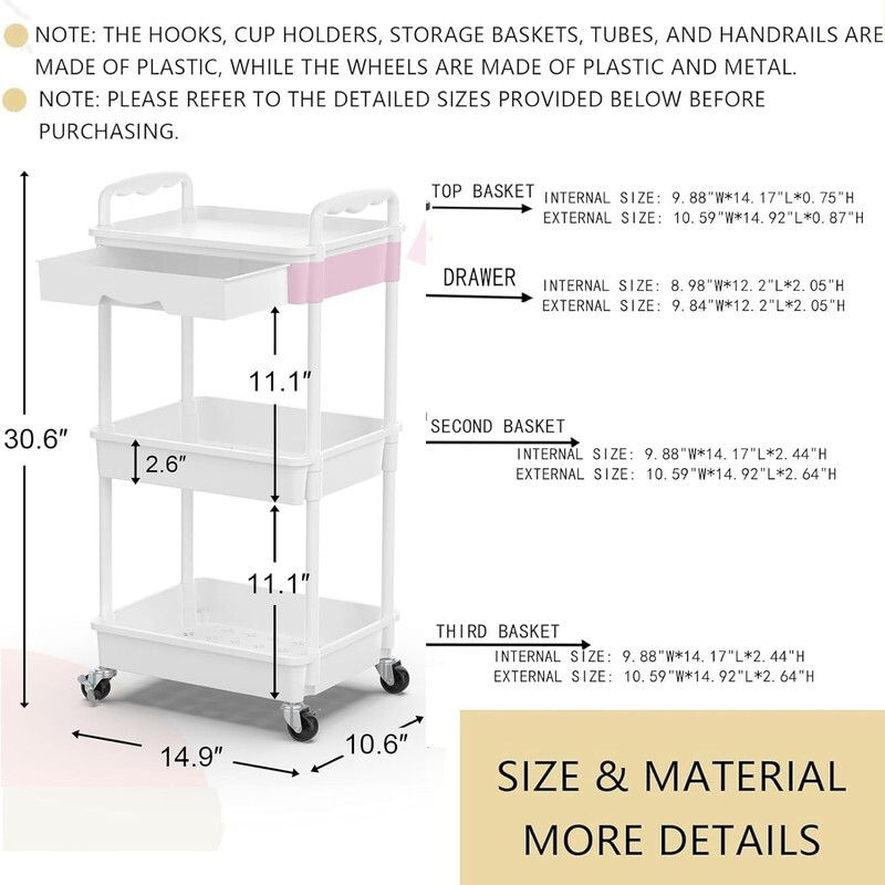 ?2 Cups 4 Hooks Included?Practical Accessories come with the utility carts with wheels. They provide dedicated storage for specific items, be more more convenient to store and access what you need. This organization can lead to increased productivity and efficiency in various settings.