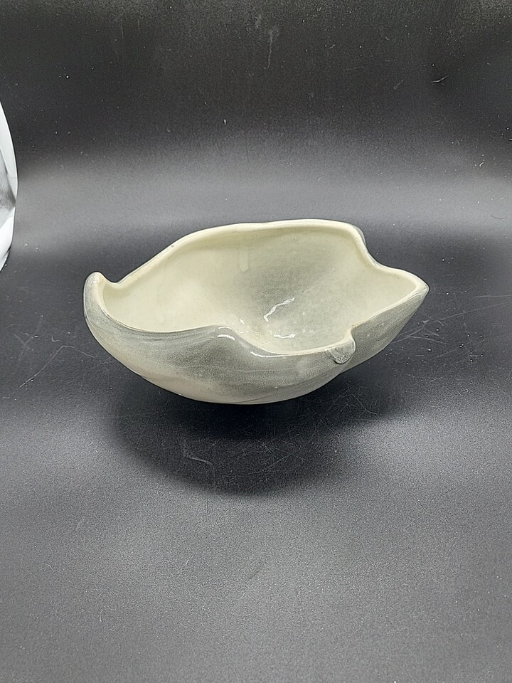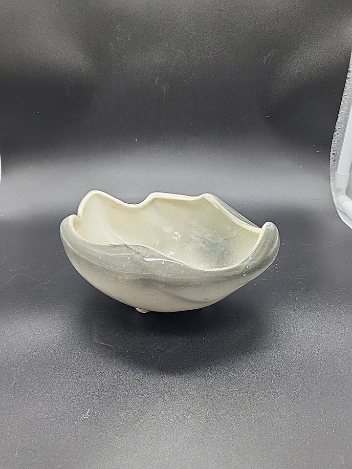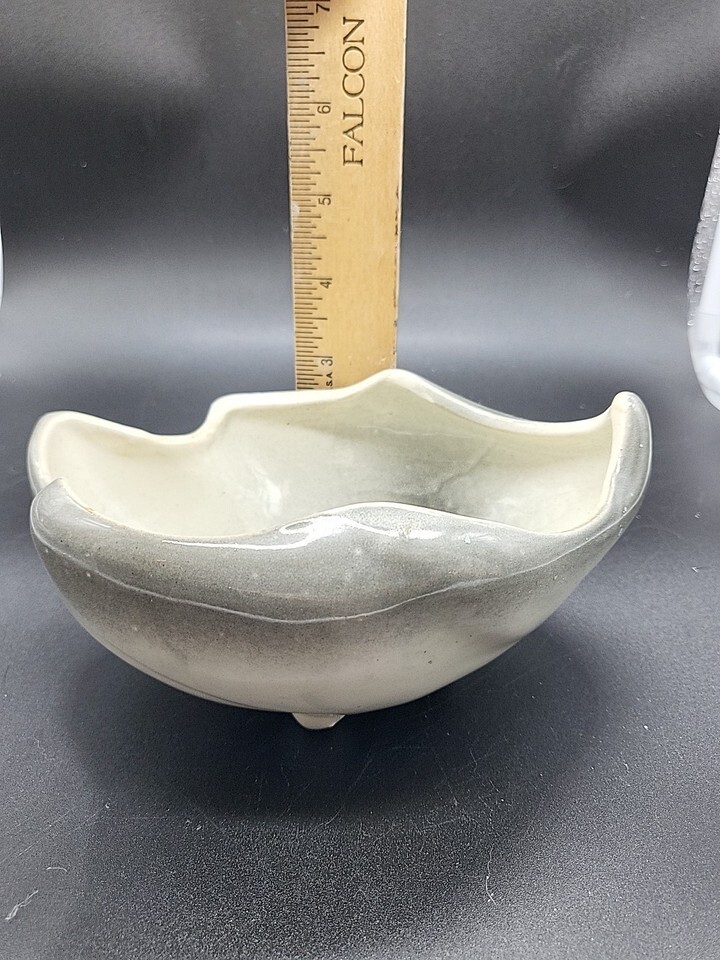 This vintage USA Pottery planter bowl is a stylish and unique addition to any home. The cream, blue, and gray glaze gives it a mid-century modern aesthetic, while the abstract shape adds a touch of artistry. Made of ceramic in the United States, this 6 1/2" footed planter is both functional and decorative, perfect for showcasing your favorite plants or adding a pop of color to your space. The glossy finish and all-over pattern make it a versatile and eye-catching piece for any pottery enthusiast.
