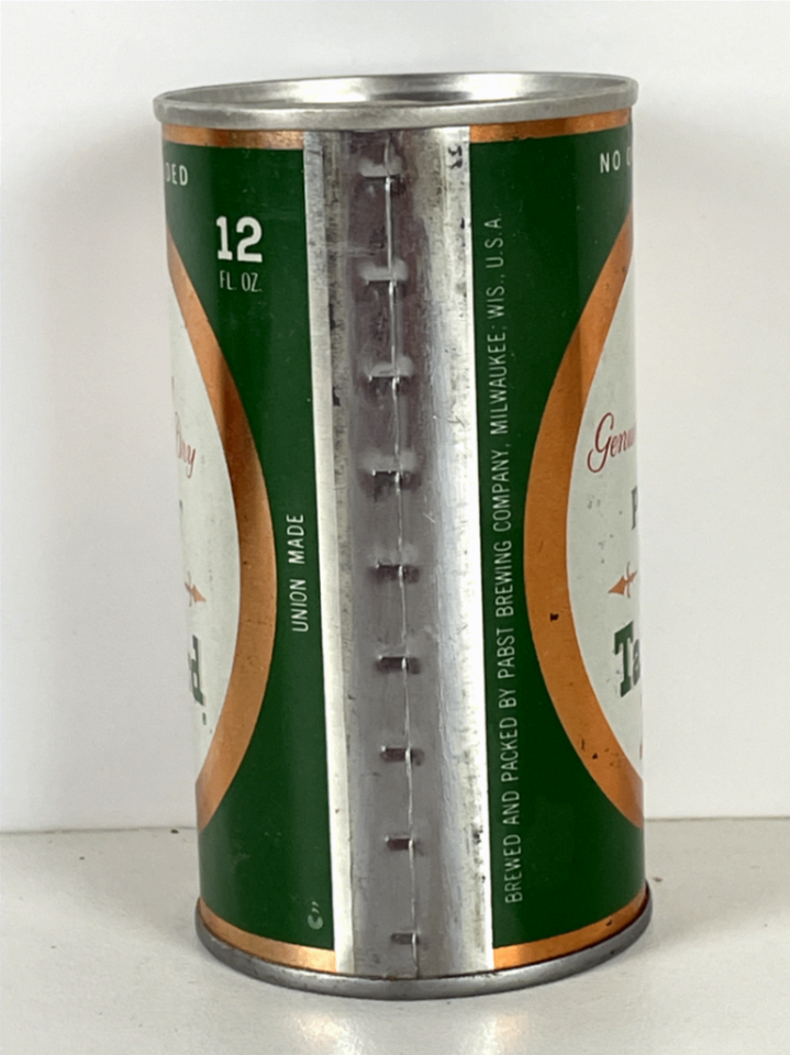 The can's design is a perfect blend of historic aesthetics and mid-century brewing heritage, making it a must-have for collectors of breweriana and vintage beer memorabilia. Its embossed details and unique artwork emphasize Pabst's commitment to quality and tradition. A great addition to any beer can collection or display, this item stands out for its distinctive color scheme, historical branding, and functional pull-tab top.