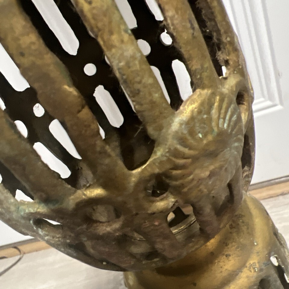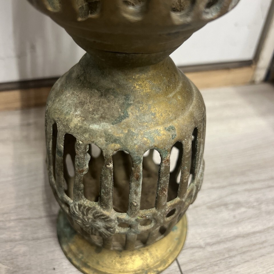 This is a unique piece, I?m not sure if it?s meant to be a candle pillar or a plant stand? Or it may be part of something else the way I have it pictured is the way it sits flat. The other end needs something flat to make it?s steady. Period it is old and has patina, I will not polish or clean and will leave that to the buyer.