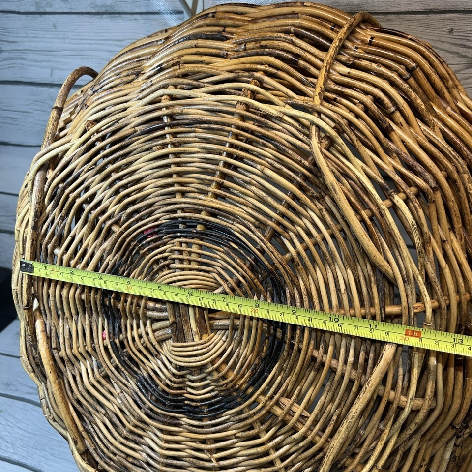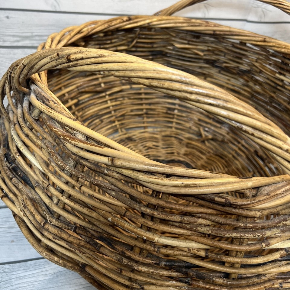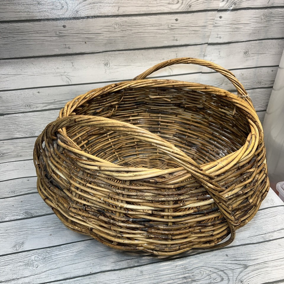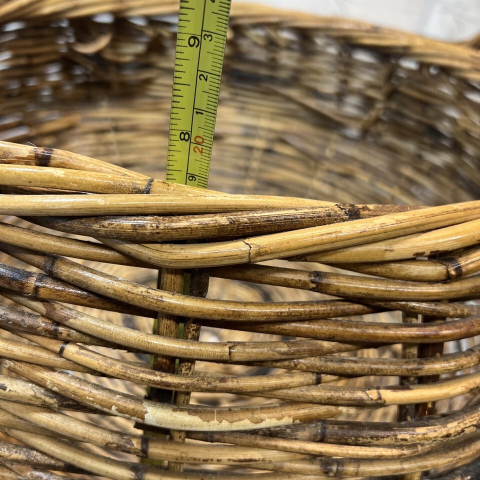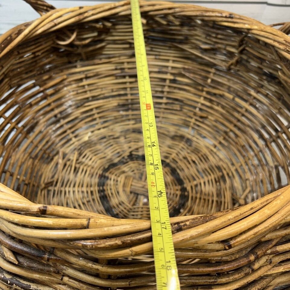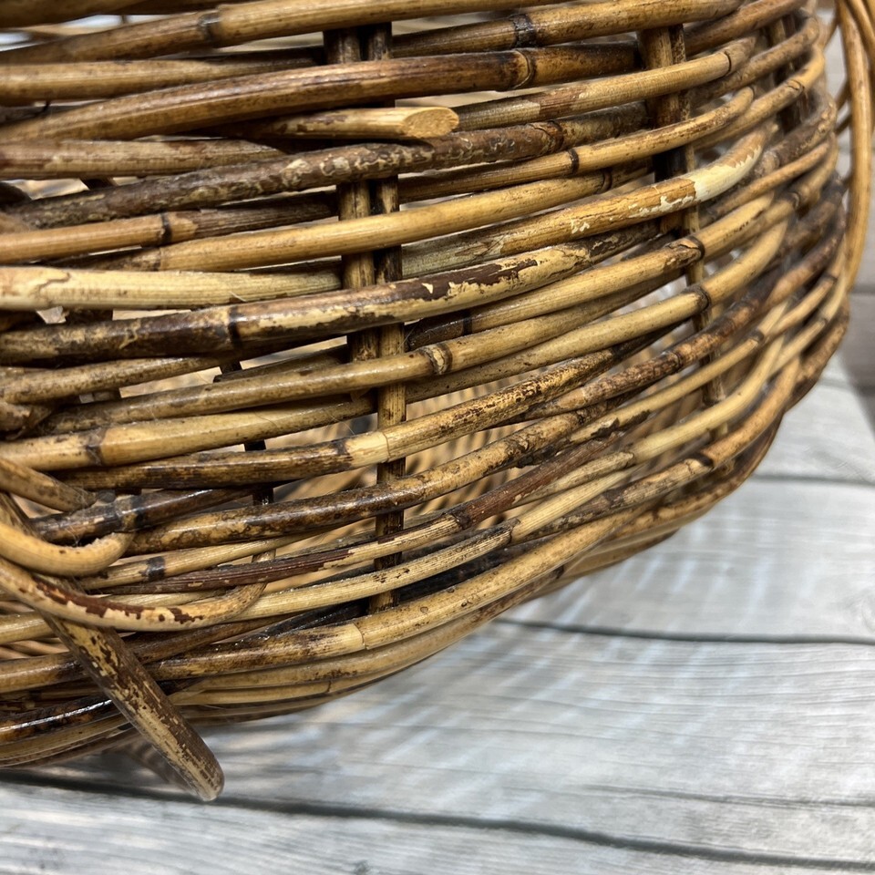 The Antique Gathering Storage Basket with Grapevine Braid Handles is a large, oval-shaped basket made of wood with a brown color and antique finish. It is a French Gathering Basket from the early 1900s, featuring intricate grapevine braid handles for easy transportation. This vintage piece is perfect for all occasions and adds a touch of primitive charm to any decor. The item measures 24 inches in length, height, and width, making it a unique and stylish addition to any collection of decorative collectibles.