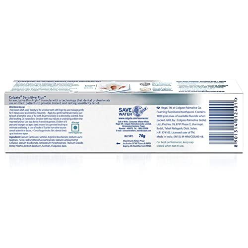 Product description: Tooth Sensitivity? No Chance!Receding gums and damage to your enamel can expose thousands of microscopic channels which lead to your tooth?s centre. When your teeth make contact with something cold, hot or sweet, sensations are carried down these channels directly to the centre, causing tooth sensitivity. Colgate Sensitive Plus toothpaste gives instant relief from pain with its unique PRO-ARGIN Technology While most sensitive toothpastes primarily numb sensitivity, Colgate Sensitive Plus builds a calcium-rich layer that plugs the exposed channels to protect sensitive teeth from sudden shocks of pain, instantly