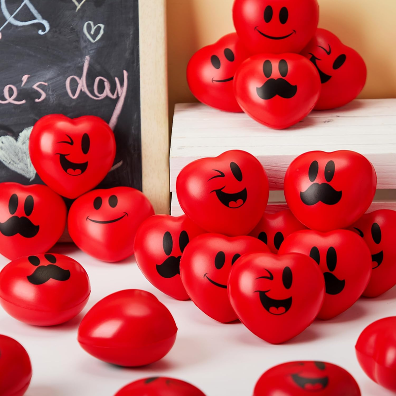 UNIQUE DESIGN. There are 3 featured facial designs in the red heart shaped balls set. Each one has vibrant colors which measures 3*3 inch. The balls are squishy toy enough that kids and adults will surely enjoy.