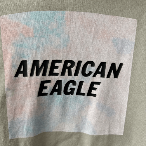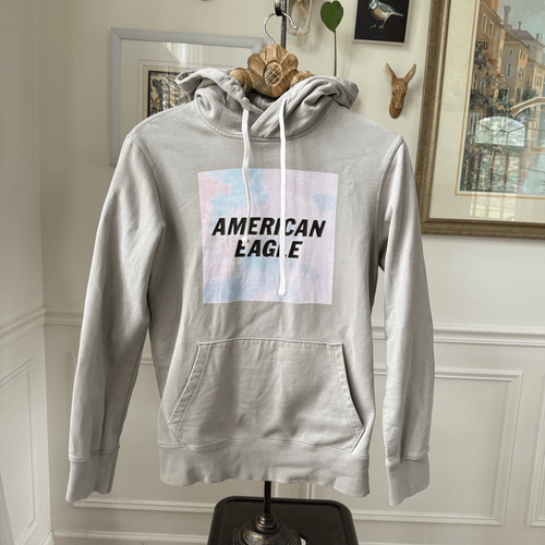 American Eagle men?s light gray pullover hoodie with kangaroo pocket and logo decal at the center chest. The logo decal is in a cloudy pink and light blue square that looks to me like the cover of Taylor Swift?s lover album except it says American Eagle in the center. 100% cotton. Laying flat measures 26 inches shoulder to hem and 19 inches armpit to armpit.