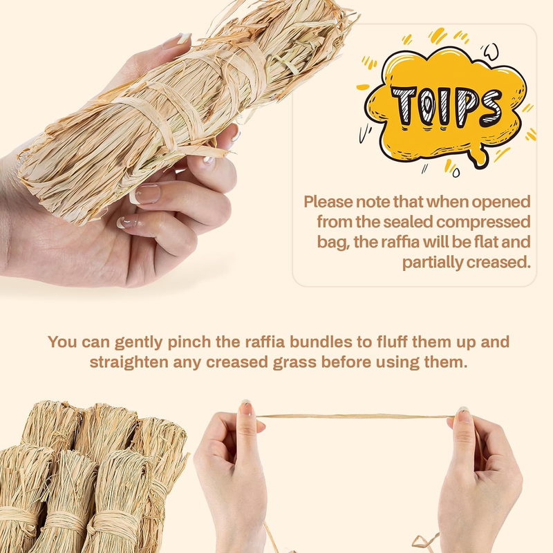 Package includes: 1 bag has 3 thick raffia bundles (enough for year-end decor/DIY). Vacuum-sealed to keep it dry and intact. Note: Fluffs up after opening?ready to use instantly.