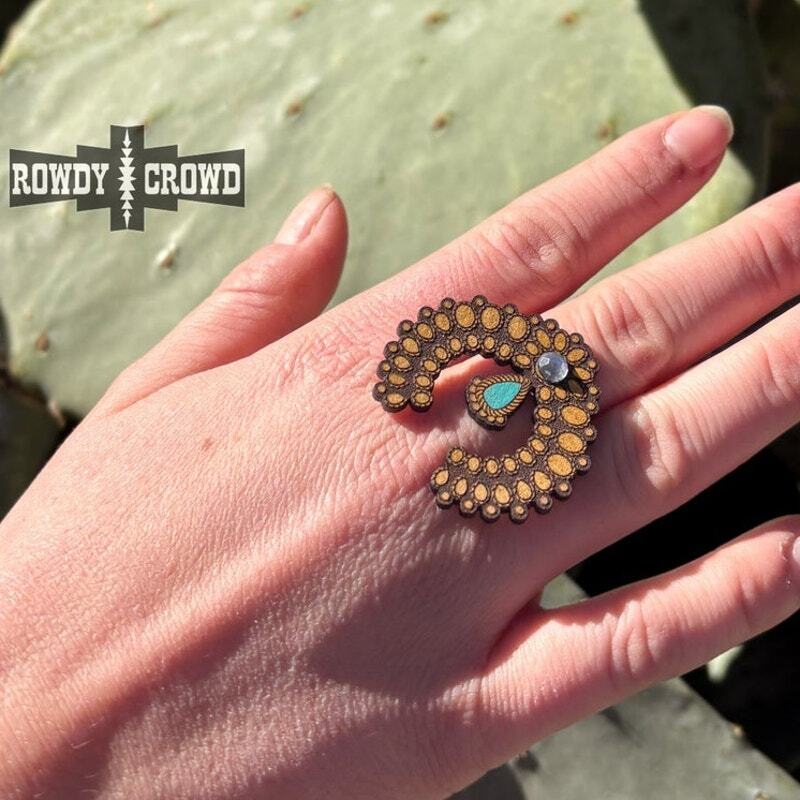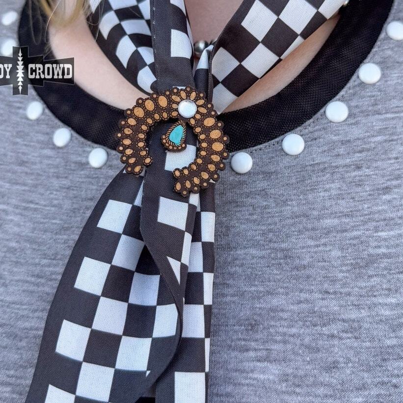 Our newest addition to our leather, the Kingsville scarf slide is the most colorful of them all. Crafted from 100% stained leather, a touch of turquoise and a sparkling rhinestone, this scarf slide is perfect for dressing up every outfit as a ring, tee clip or scarf slide for all the rhinestone cowgirls out there.