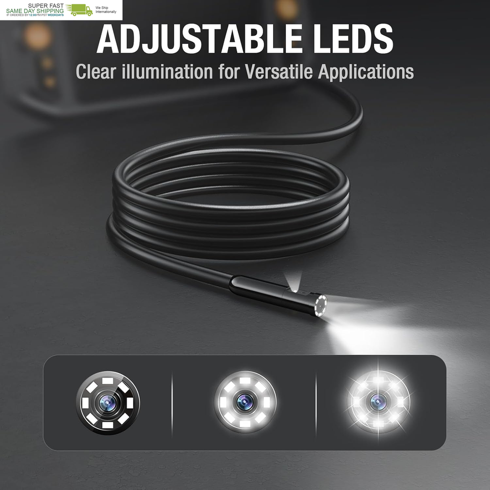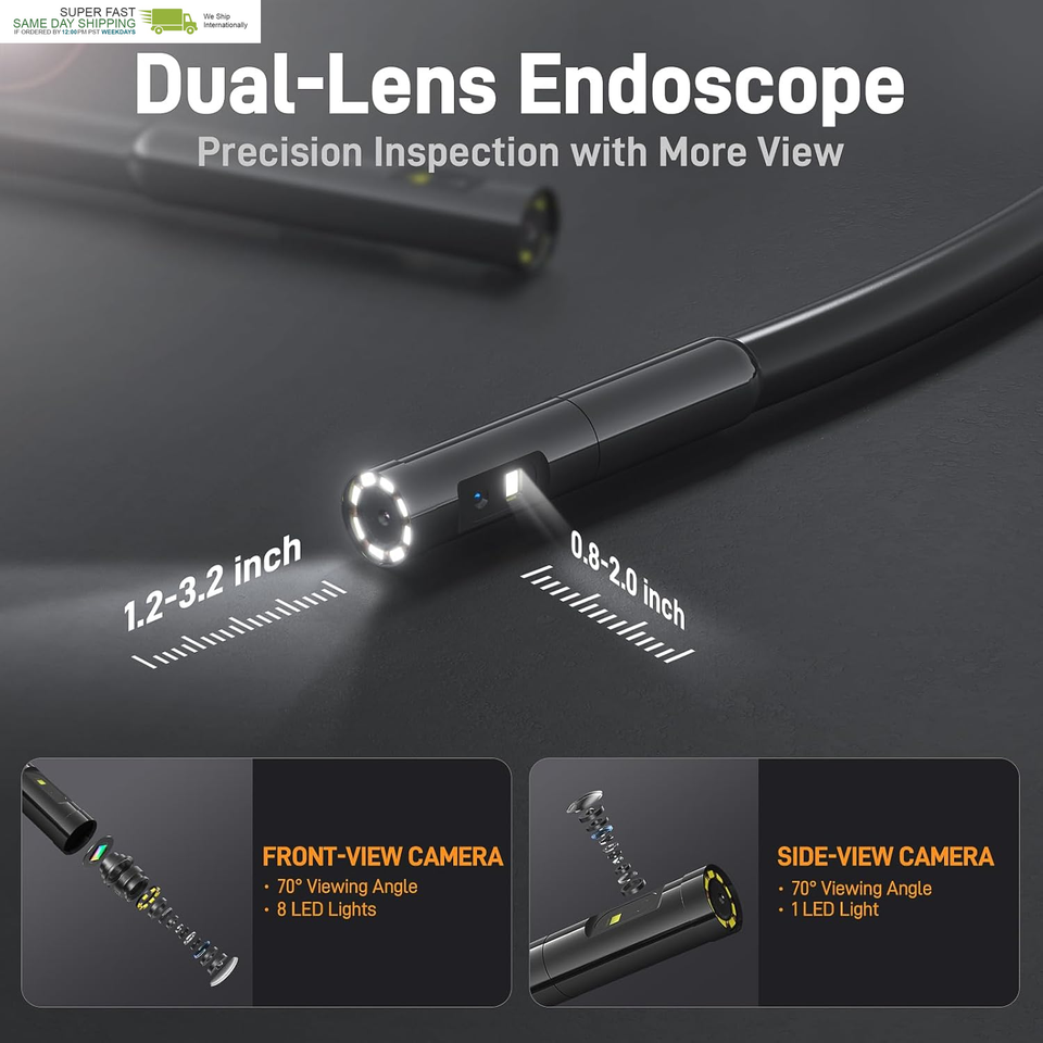 Dual-Lens Design with 8 Adjustable LED Lights for Clear Inspections: With both forward-facing and side-mounted lenses, this borescope camera lets you view hard-to-reach areas from multiple angles, saving you time and ensuring you don?t miss a detail. Paired with 8 adjustable LED lights, you can easily illuminate even the darkest spaces for clear, bright images, making inspections faster and more efficient.
