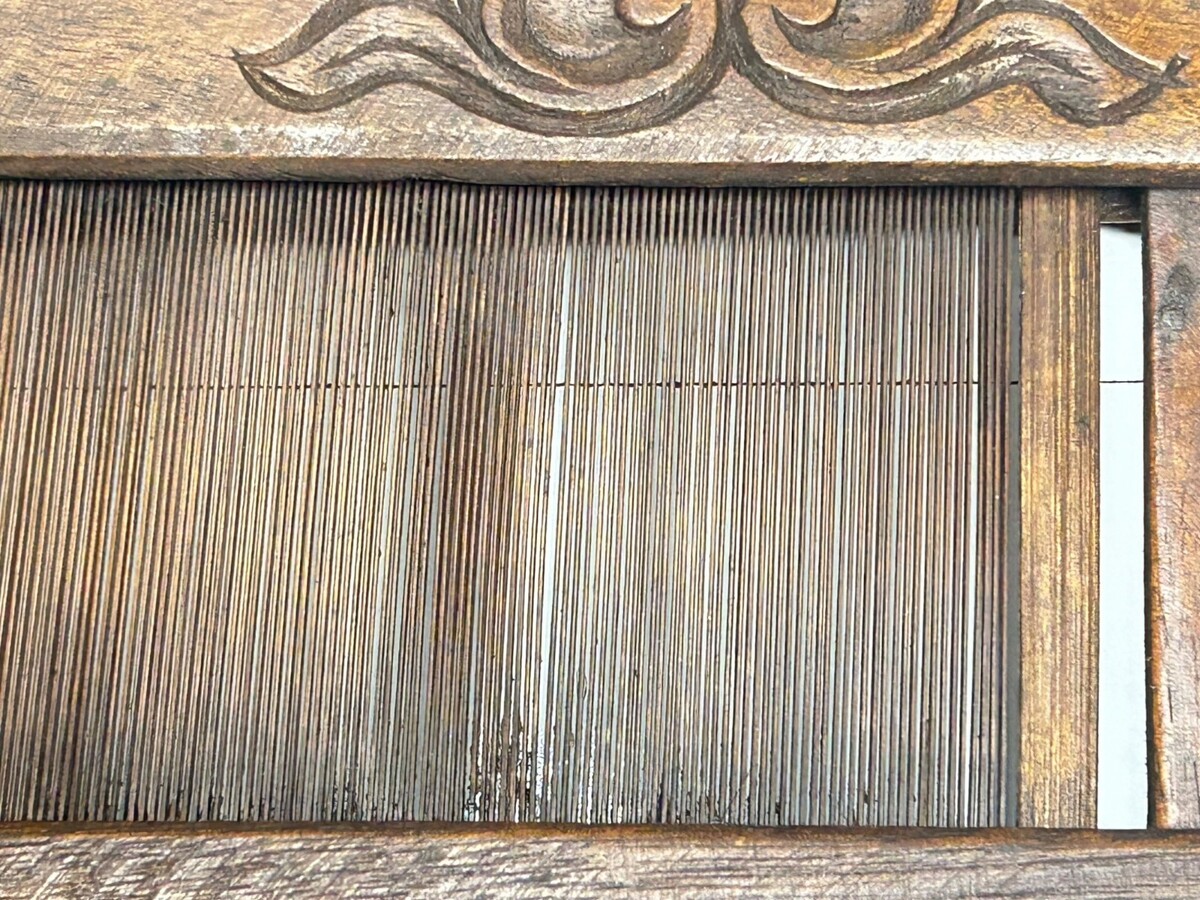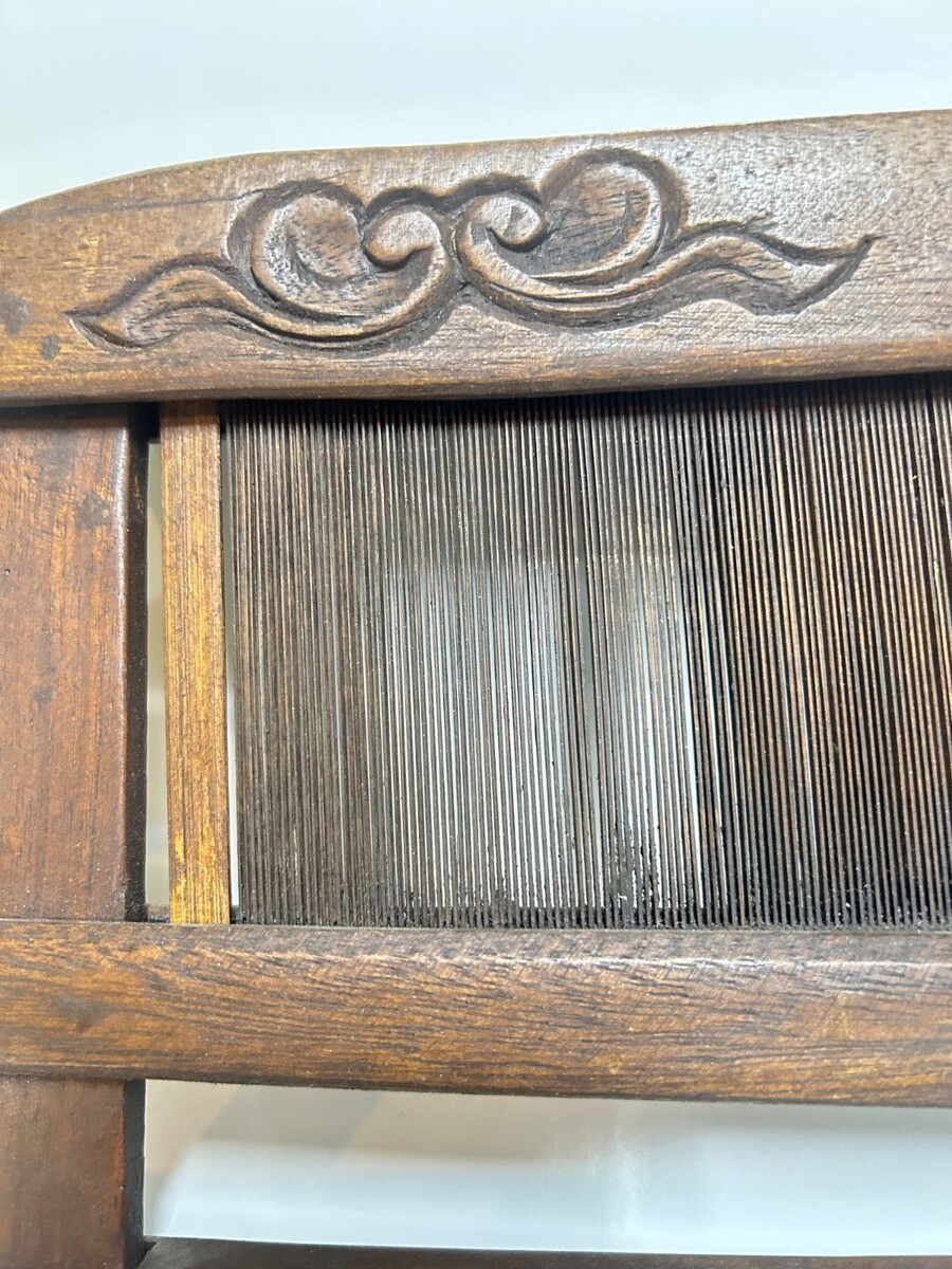 Sadly one side of the top portion is broken as seen in final photo. This does not affect the functionality of the loom, but does affect the aesthetics of it. Minor wear on wood and slight discoloration on the reed from age and use. Otherwise, all intricate wooden bristles are intact. This would make for an excellent wall hanging a conversation piece.