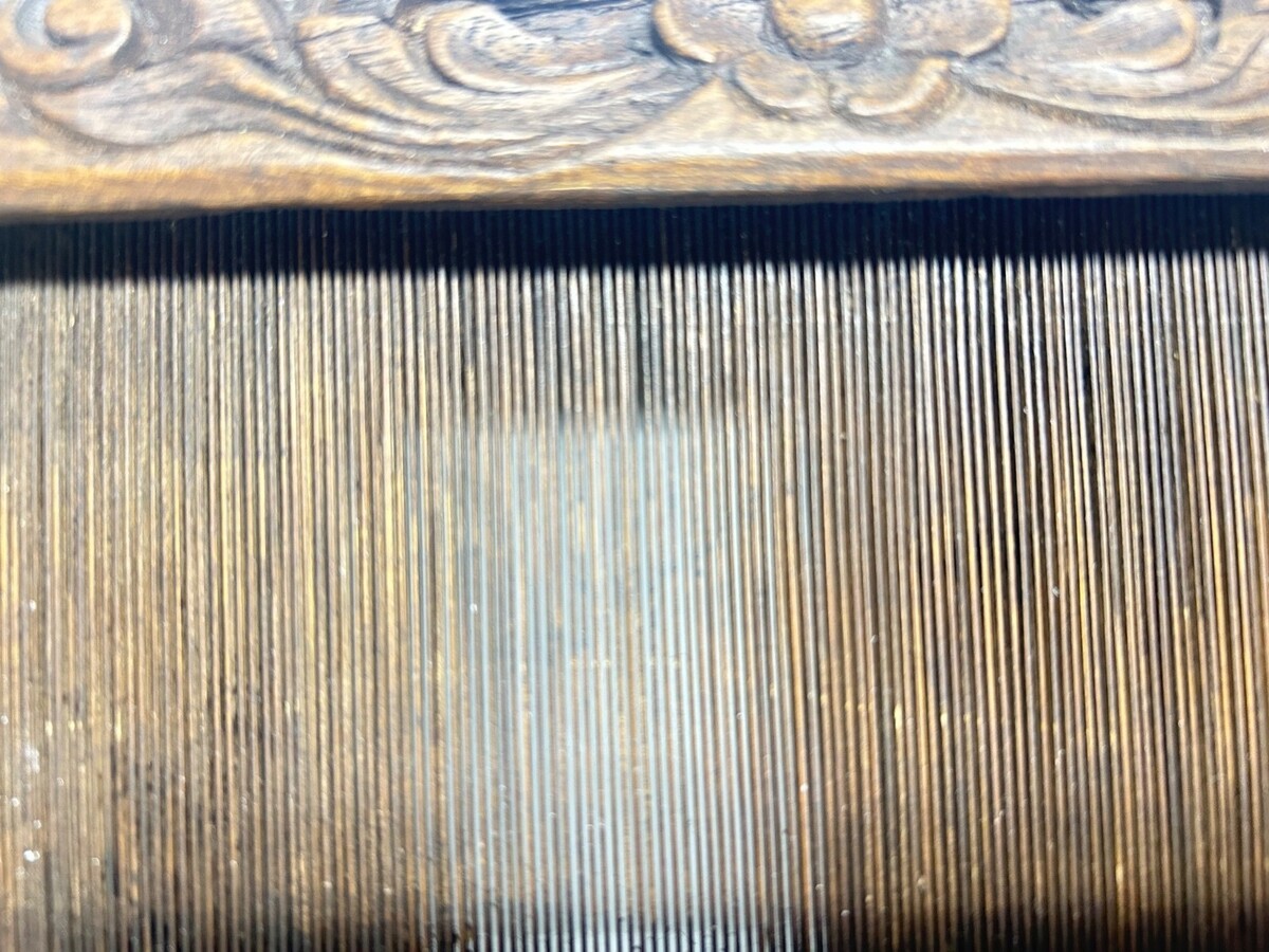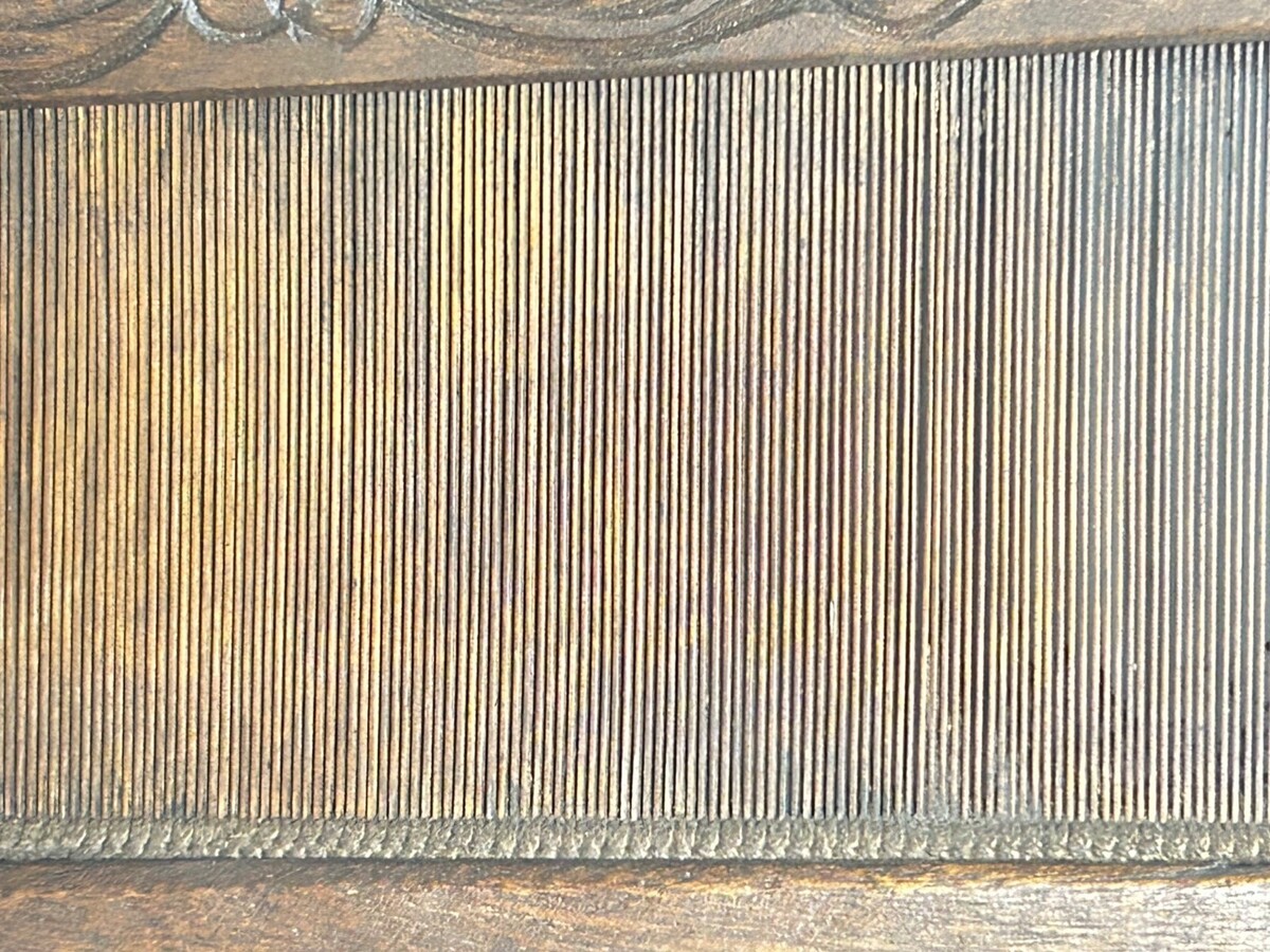 This vintage wooden handloom reed showcases intricate floral carvings and fine craftsmanship, a beautiful relic of traditional weaving practices in Thailand. This handcrafted wooden loom was designed for separating warp and beating weft yarn, the most essential part of a handloom in many cultures in Thailand.