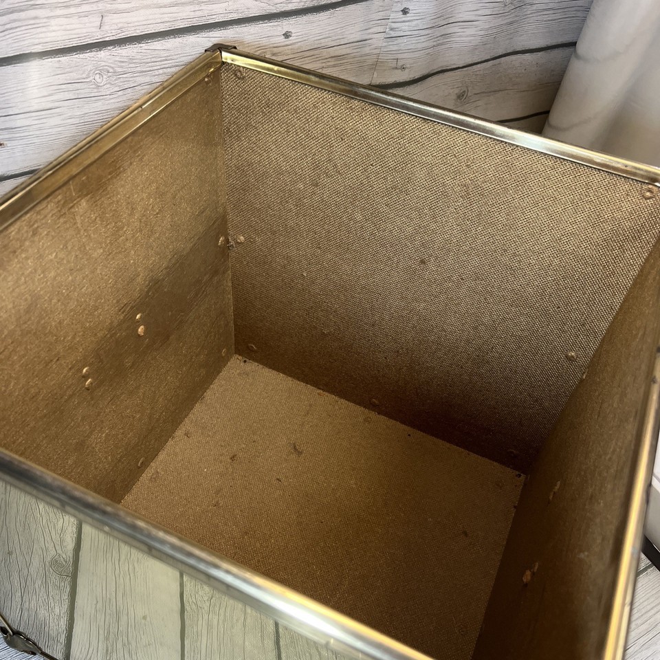 This vintage brass gold tone metal trunk chest (no lid) exudes Hollywood Regency mid-century charm. With a solid rectangular shape, brass handle finish, and gold color, it embodies a timeless elegance. Crafted from brass and metal, this chest is not only stylish but also sturdy and durable, perfect for storing blankets and toys or plant stand in a stylish way. The Century brand adds a touch of authenticity to this piece, making it a unique addition to any antique collection or modern home decor.