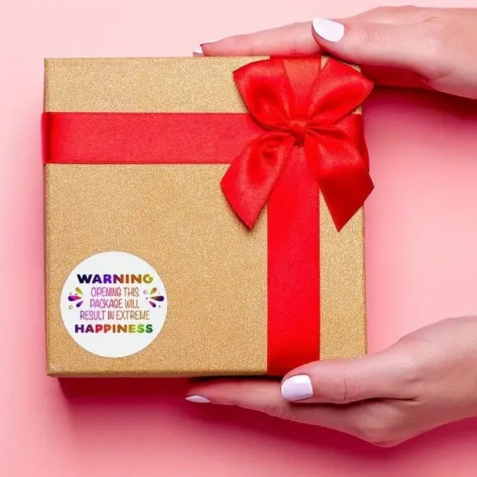 Add a touch of fun to your packages with these colorful happiness warning stickers. Perfect for parties and gifts.