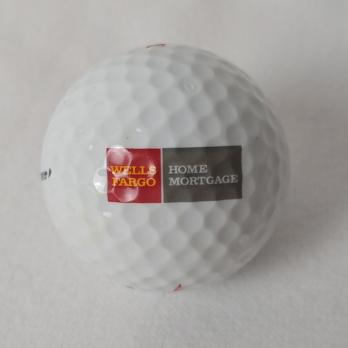 This listing is for a single pre-owned Titleist white golf ball. This golf ball features the logo and name "Wells Fargo Home Mortgage". It is clean and has minor wear. The ball is suitable for normal play.