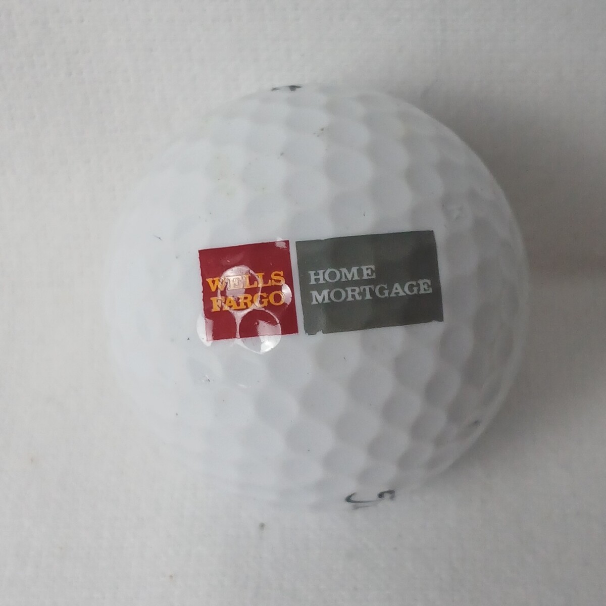This listing is for a single pre-owned Titleist white golf ball. This golf ball features the logo and name "Wells Fargo Home Mortgage". It is clean and has minor wear. The ball is suitable for normal play.