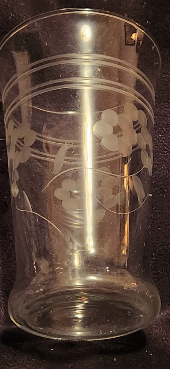 Good used condition glass. Etched design. Flowers and line. No chips or cracks. 4.75 inches tall.