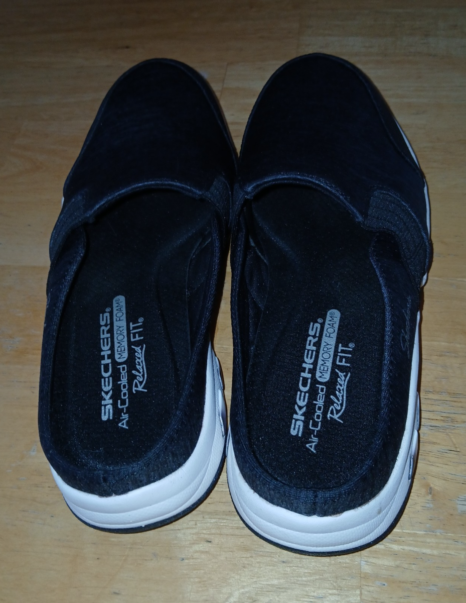 THIS IS A GREAT PAIR OF LADIES SKECHERS AIR-COLLED MEMORY FOAM RELAXED FIT SLIP ON LOW BACK SHOES IN A SIZE 8. THEY ARE IN EXCELLENT, WORN ONCE, CONDITION.