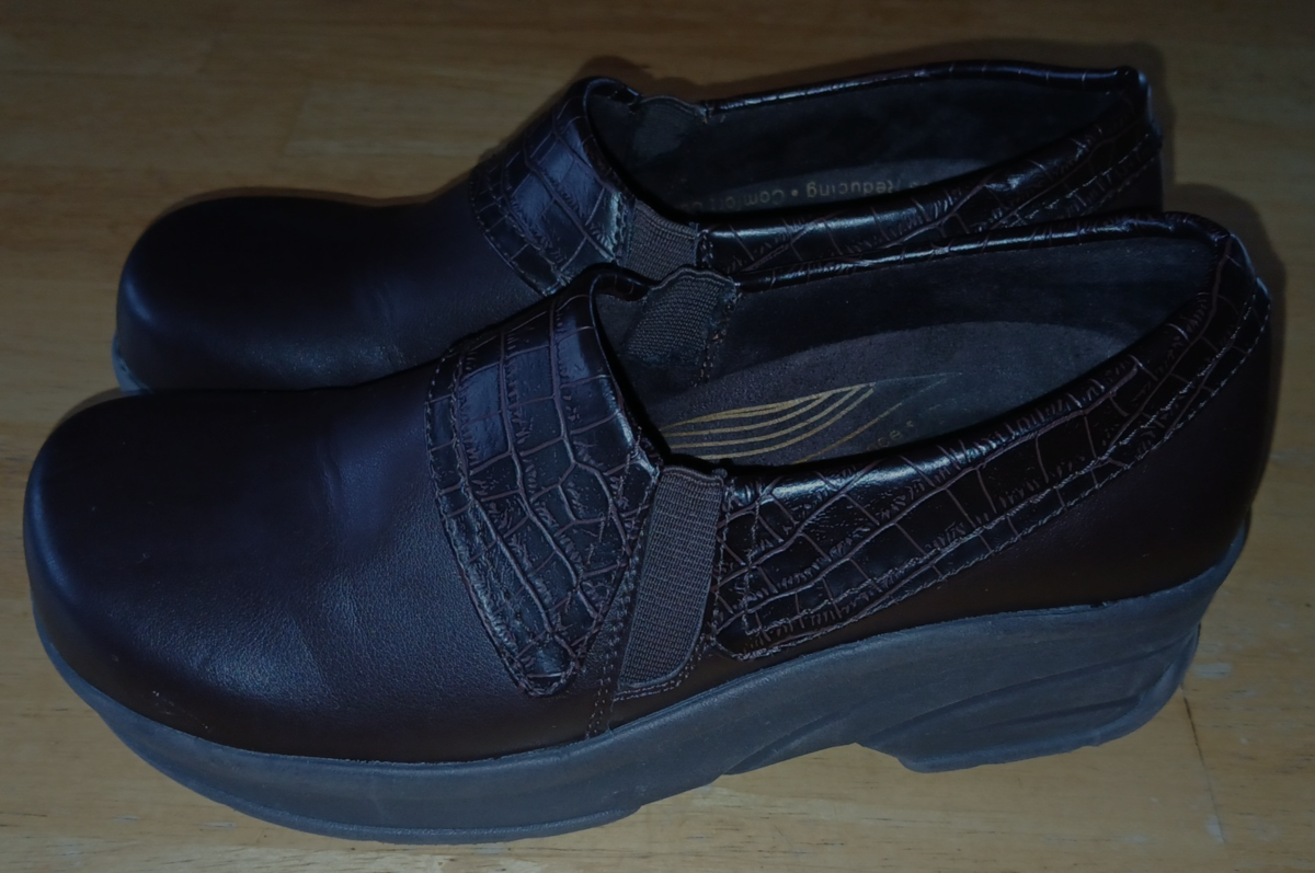 THIS IS A PAIR OF LADIES EASY WORKS BY EASY STREET BROWN LEATHER SLIP-ON MULES IN A SIZE 8.5M. THEY ARE IN EXCELLENT, GENTLY WORN, CONDITION.