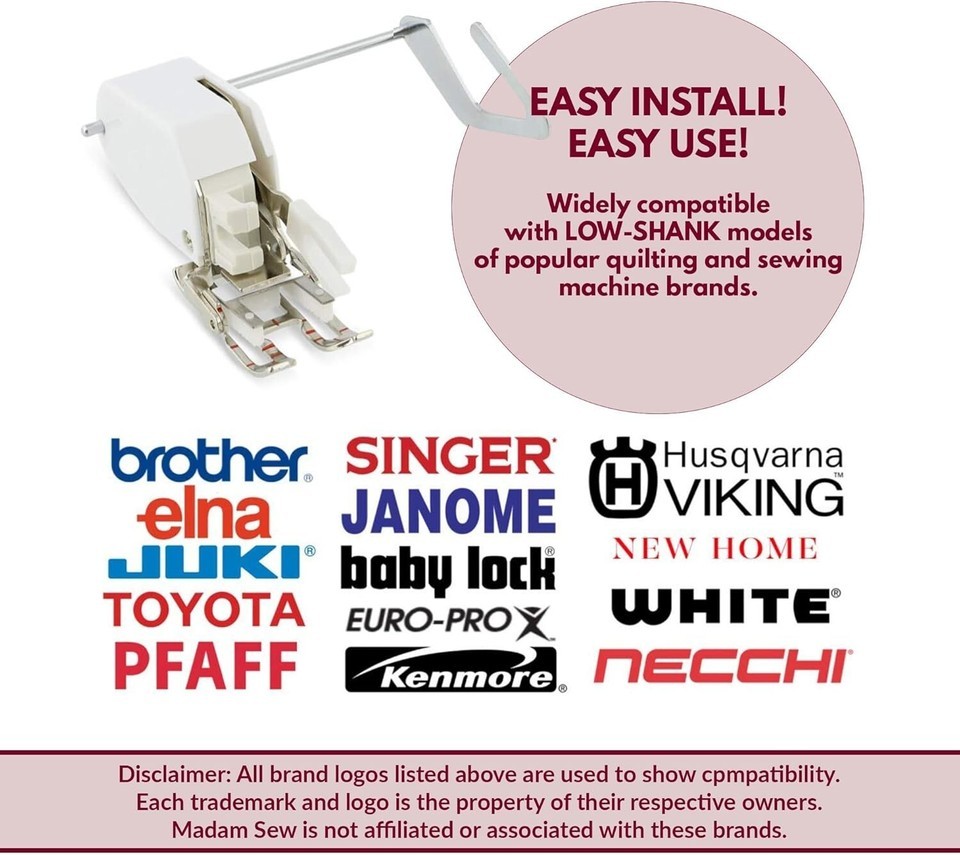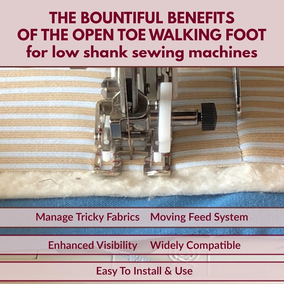 COMPATIBLE WITH MOST LOW SHANK MACHINES - This walking foot is compatible with most popular sewing and quilting machine products and models. The open toe walking foot fits on most low-shank models of Babylock, Bernina, Brother, Elna, Euro-Pro, Husqvarna, Kenmore, Necchi, Pfaff, Singer, Simplicity, Toyota, Viking, White, and more.