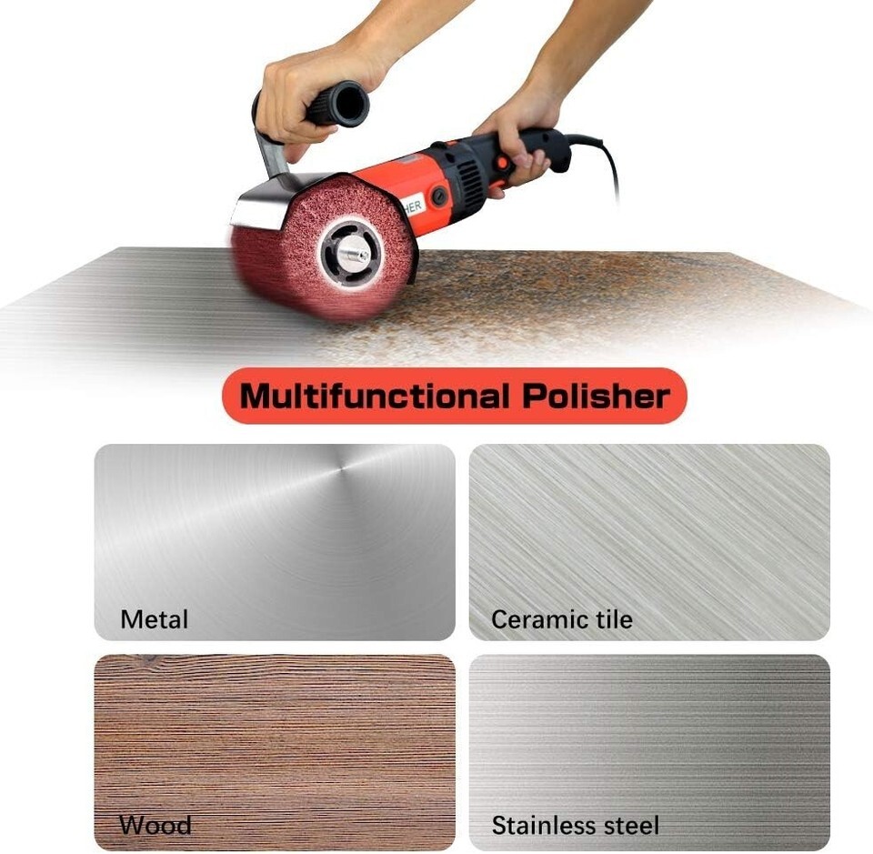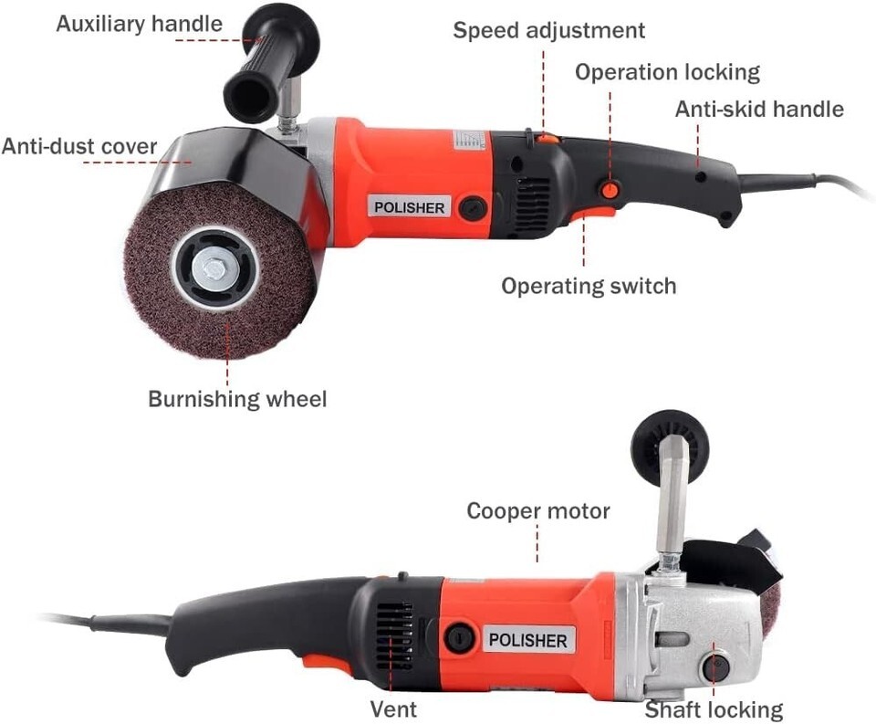 ?Easy Operation?-- Equipped with main anti-skid handle and sided handle,built-in 3m electric cable,this metal burnishing machine works more stably and freely.Thickened anti-dust cover better prevents the damage from flying dust while is a screw on the cover for adjusting tightness,please tighten the screw after installing the cover so that the cover will not loose during operation