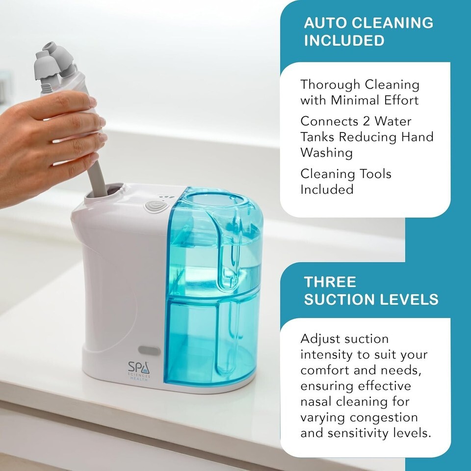 DUAL POWERED RINSE AND SUCTION. uses an innovative USB rechargeable dual pump mechanism to simultaneously rinse the nasal cavities and suction out allergens, mucus, and germs. Compared to traditional nasal sprays and other nasal irrigation methods, provides larger volume and controlled flow of saline solution with adjustable pressure for a more customized experience and potentially more thorough cleansing.