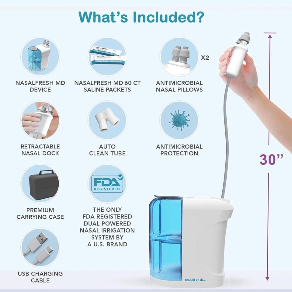 EASY MAINTENANCE - AUTOMATIC CLEANING ? ELECTRIC RECHARGEABLE - NasalFresh is cordless and rechargeable so forget about needing to replace batteries. And is easy to maintain with built-in product protection, and an included auto-clean feature that flushes out the entire system.