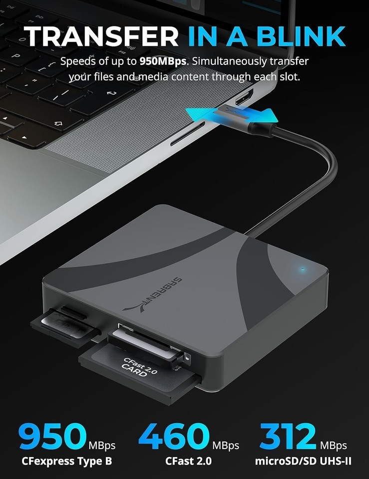 Superfast CFexpress and CFast: High-bandwidth cameras require high-performance, reliable memory cards in the CFexpress Type B and CFast formats. The USB-C Multi-Card Reader can handle both at up to 950MBps and 460MBps, respectively. Transfer your videos and other high-quality media without burdensome downtime.