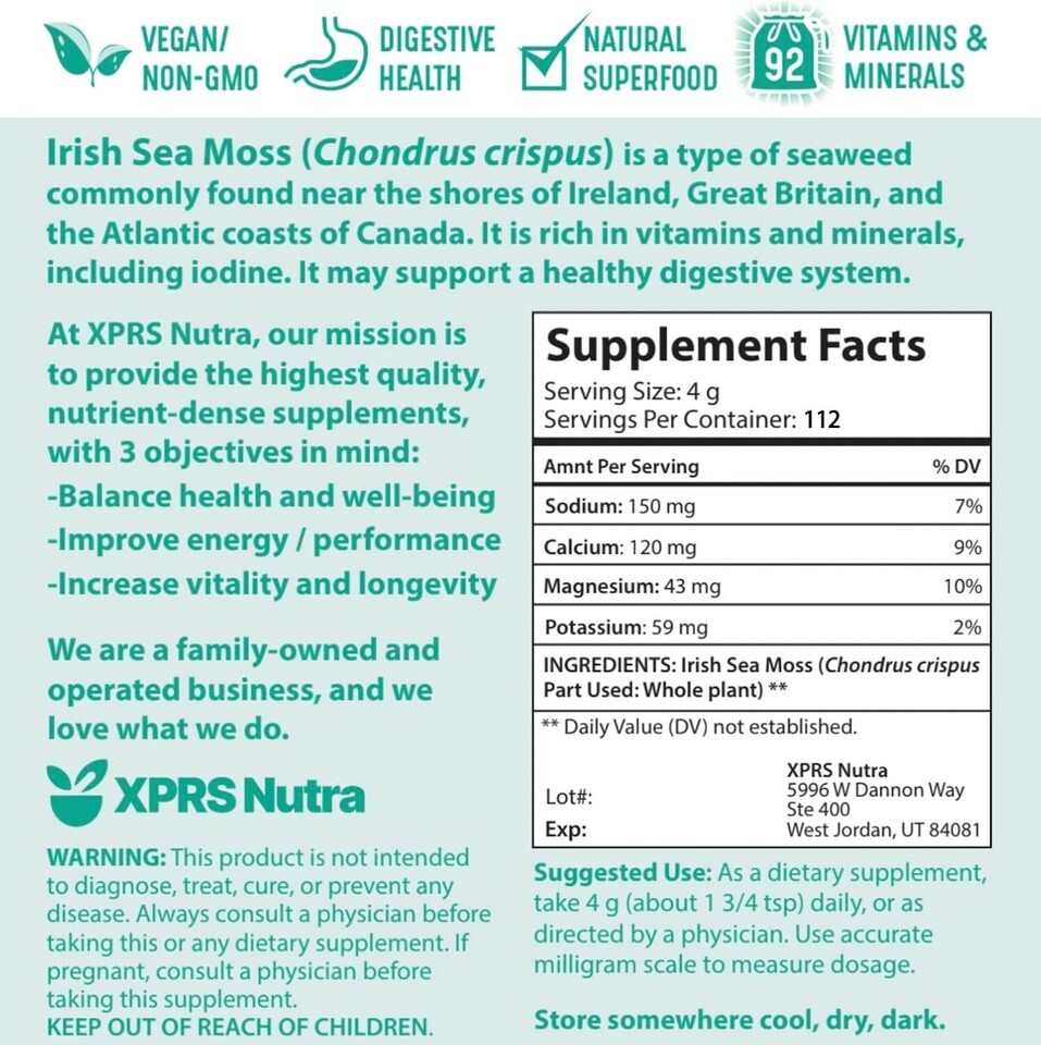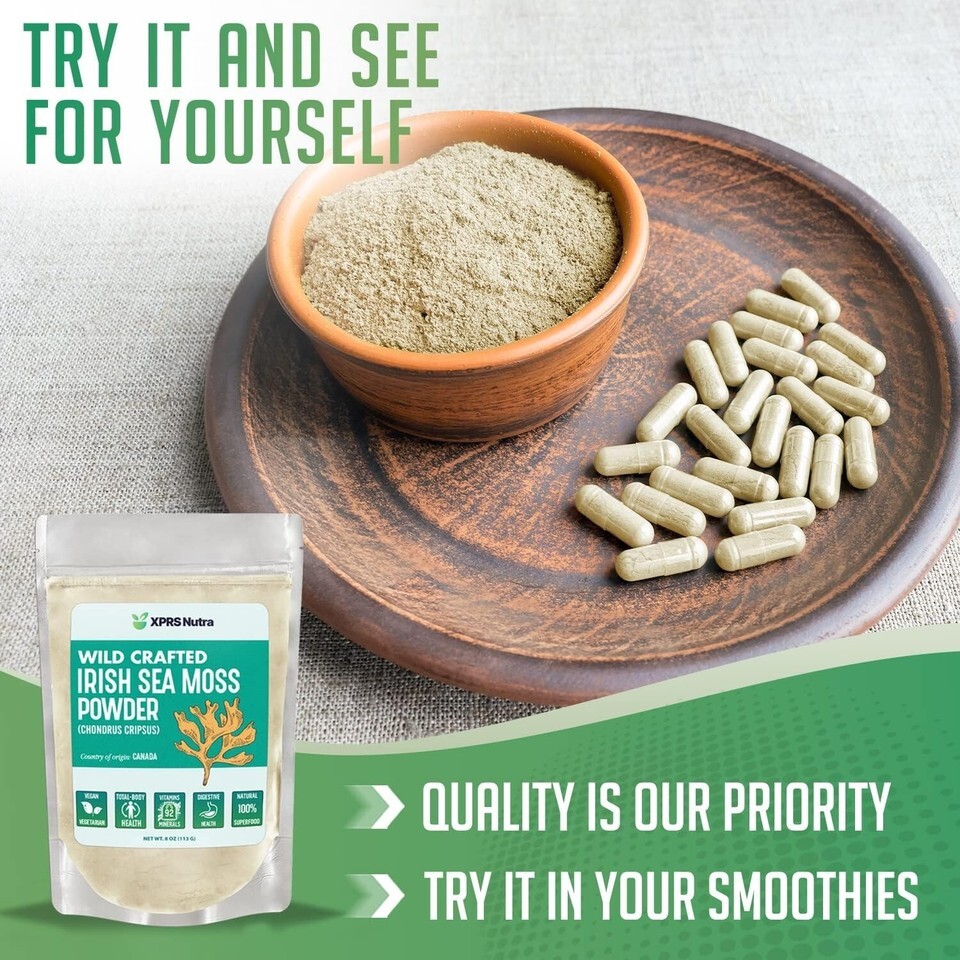 Pure Canadian Irish Sea Moss Powder: Our sea moss powder is carefully sourced from trusted suppliers in Canada that are meticulous about quality. This pure seaweed powder is a natural source of iodine, rich in 92 essential minerals as well as Beta-Carotene, Vitamins B, C, Zinc, and more. Our seamoss powder contains no additional ingredients or fillers.