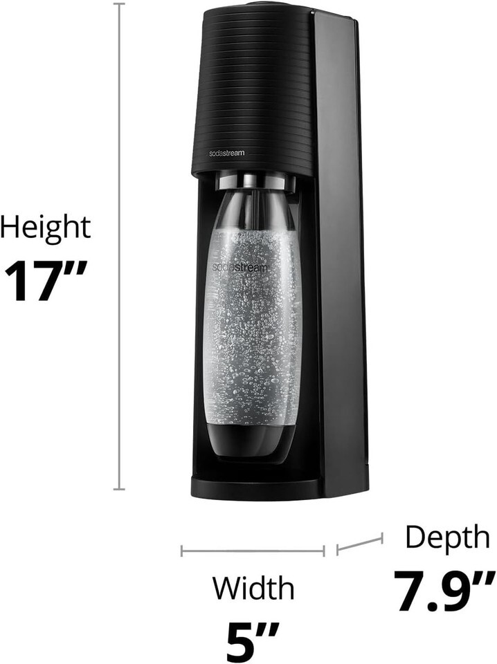The Terra Sparkling Water Maker turns plain water into fresh sparkling water in seconds at the push of a button and designed for the modern kitchen. Featuring new Quick Connect technology for fast and easy CO2 cylinder insertion. The improved design features an elegant matte finish, updated slim silhouette, improved ergonomics, a dishwasher safe carbonating bottle and Quick Connect CO2 cylinder technology. Manual carbonation, no batteries required. One reusable carbonating bottle can save up to thousands of single use plastic bottles. Always fizz water before adding any flavor.