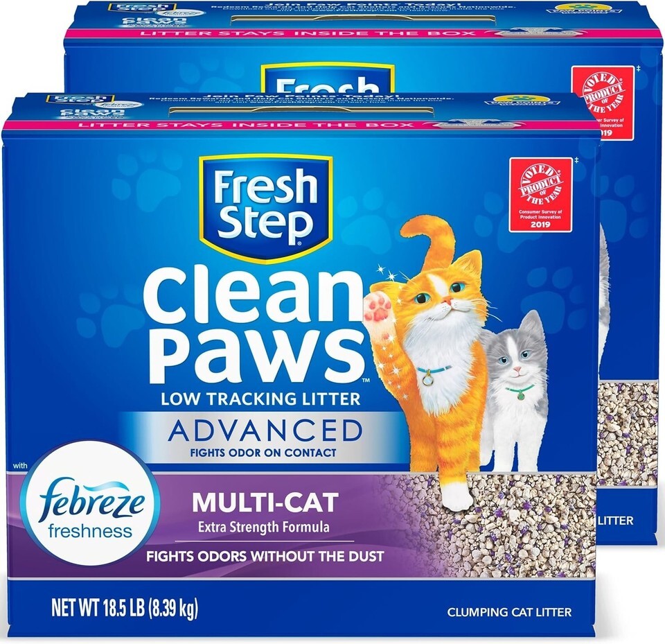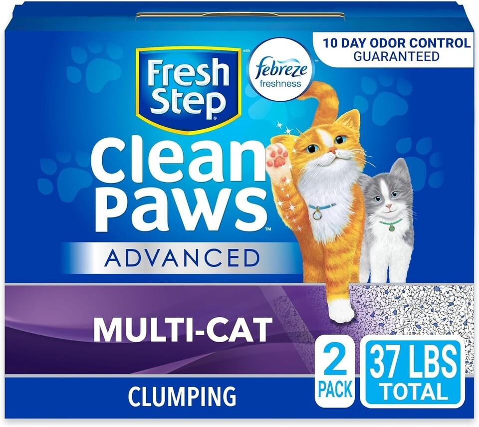 Clean Paws Advanced Multi Cat Extra Strength clumping cat litter is pet and paw friendly. Created by the makers of with your cat's health and happiness in mind using a tough odor eliminating formula and the power of Febreze. Made with larger, high quality clay particles that are designed with specific density and shape, Clean Paws low tracking litter stays in the box to help keep paws and your home clean. This litter offers 10-day odor control, which means more odor-fighting power for multiple cats. Clean Paws Advanced Multi Cat Extra Strength litter also clumps tight for easy cleanup. And, it is dust free for cleaner surfaces, cleaner air and reduced tracking. Cleaning is fast and easyjust add more litter to your cats litter box after you scoop. Certain trademarks used under license from Procter Gamble Company or its affiliates.