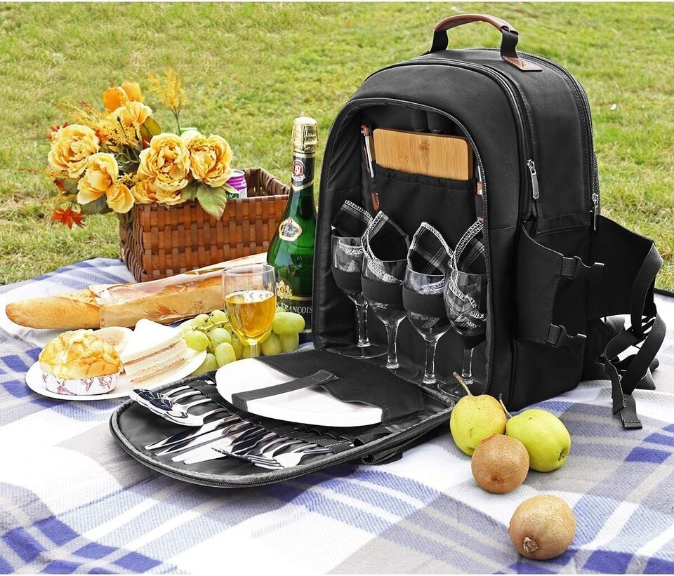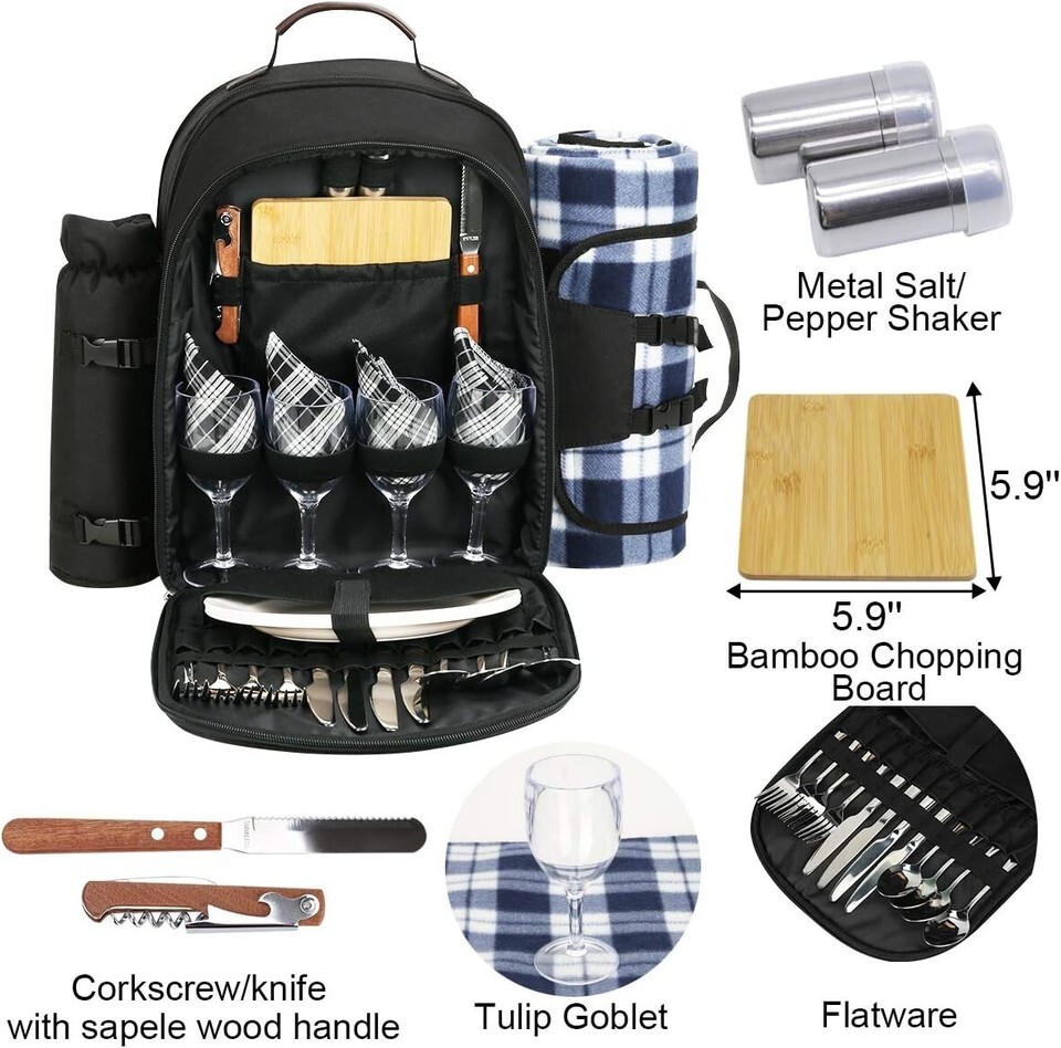 Top Notch Picnic Backpack - Premium picnic accessories are neatly organized and fixed. Insulated Picnic bag comes with 4 sets of dishwasher-safe full stainless steel flatware and hard melamine plates; 4 uni-body TPE wine glasses, 1 cheese knife wine opener, metal salt/pepper shaker and bamboo cutting board. Recipient would be presented a WOW feeling once opening this insulated picnic basket backpack.