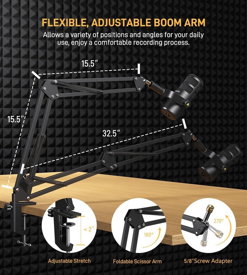 Stylish Compact Design: This XLR micro with metal body, sleek looks, compact size, makes it portable and durable. The mic with arm stand, make the micro closer to you, the adjustable boom arm allows for a wide range of positions and angles for your use case, easily set it up in a place that works best for your setup. Built -in 5/8"and 3/8" inch threads to easy installed with most mic stands