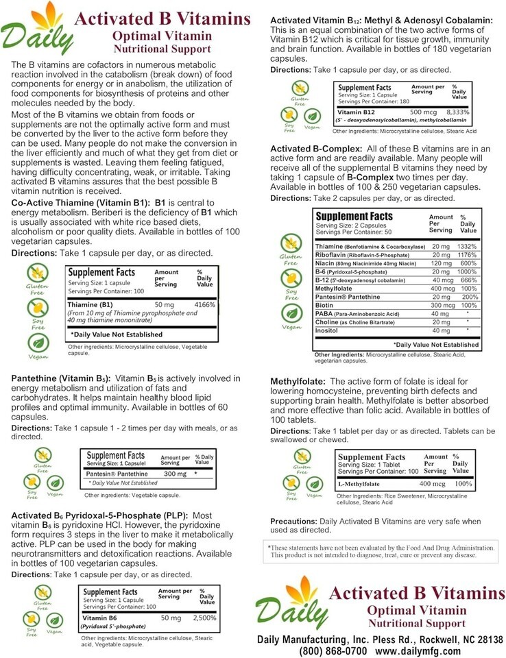 Daily's Activated B-Complex: Two capsules provide active forms of: Thiamine 20 mg, Riboflavin 20 mg, Niacin 120 mg (niacinamide 80 mg niacin 40 mg), B6 20 mg, B12 40 mcg, Methylfolate 400 mcg, Pantesin Pantethine 20 mg, Biotin 300 mcg, PABA 40 mg, Choline 20 mg Inositol 40 mg. All of the B vitamins are provided in the forms best utilized by the human body.