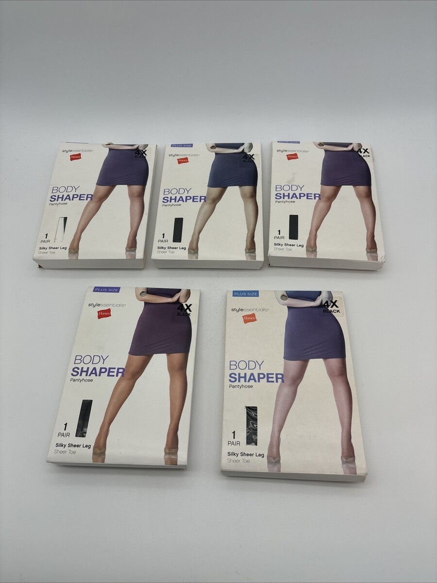 This product is a lot of 5 pairs of Hanes Style Essentials Body Shaper Pantyhose in size 4X and black color. Made of nylon and spandex, these pantyhose feature a sheer toe and a comfort flex waistband. They are designed to offer a special finish for an exceptionally soft touch and to eliminate visible panty lines. Ideal for all seasons, these shaper pantyhose are perfect for women looking for classic and comfortable underwear.
