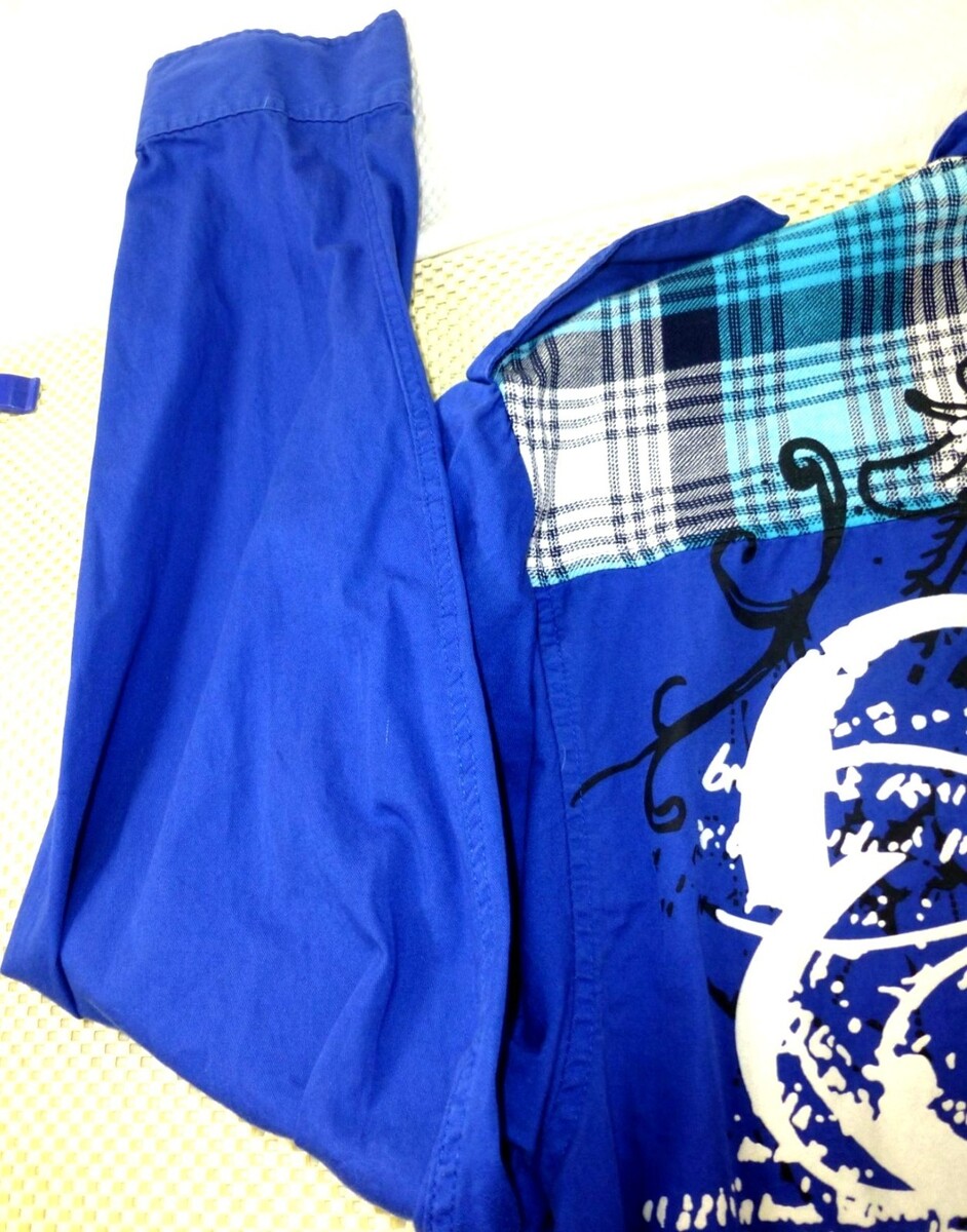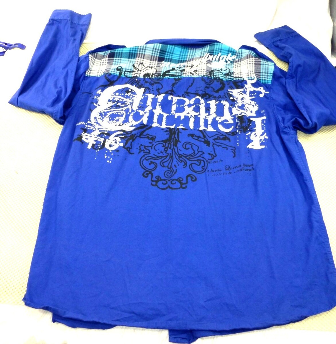 Tool Jeans Mens 4XL Blue Plaid Patchwork Long Sleeve Shirt With Graffiti Print