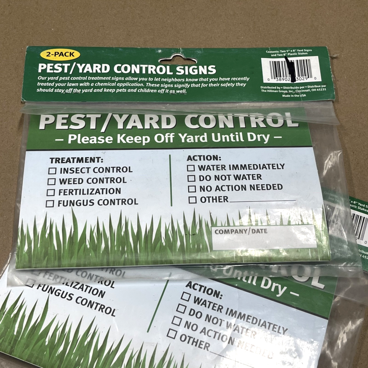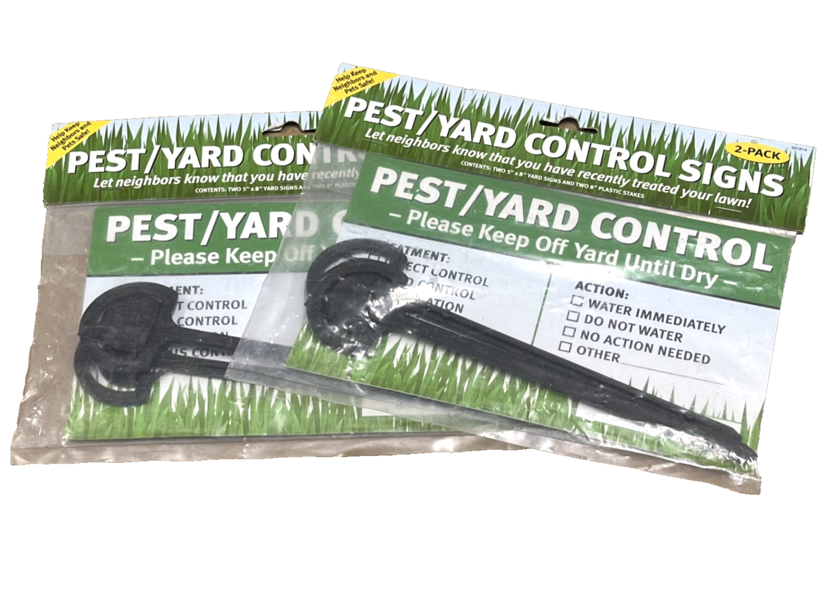 Two packs of 5" x 8" Pest / Yard Control Lawn Safety Signs. Let family and neighbors know when you have treated your lawn. Each pack has 2 signs and 2 stakes for a total of 4 signs and 4 stakes. These items are new in their retail packaging. The packaging is dusty and worn from the warehouse shelves.