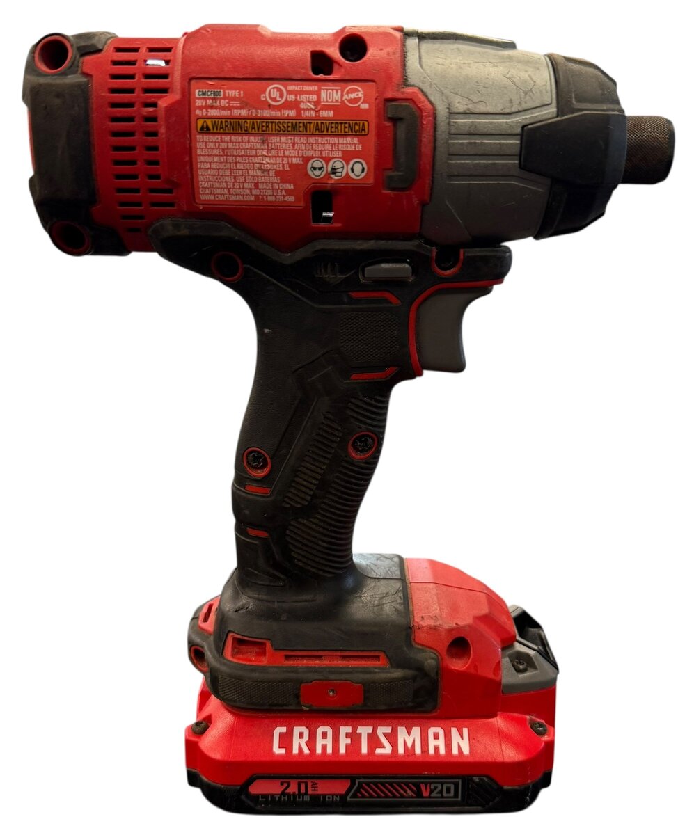 Category: Cordless hand toolsType: Impact DriverBrand: CraftsmanModel number: CMCF800Size: 1460 lbsColor: red/blackPower source: BatteryBattery Included: yesCase included: noCharger Included: noVoltage: 20vCondition:Used