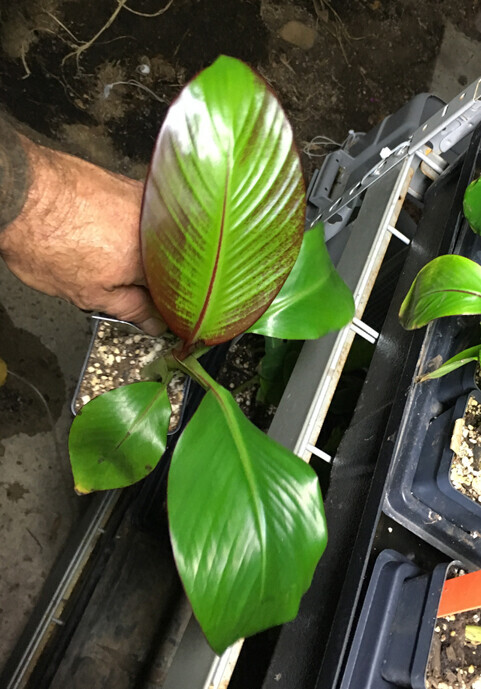 The wine-red coloring of the top of the large, 10 to 12 foot long leaves and leaf stems combined with the tall pseudo-trunk make this large tropical unique.