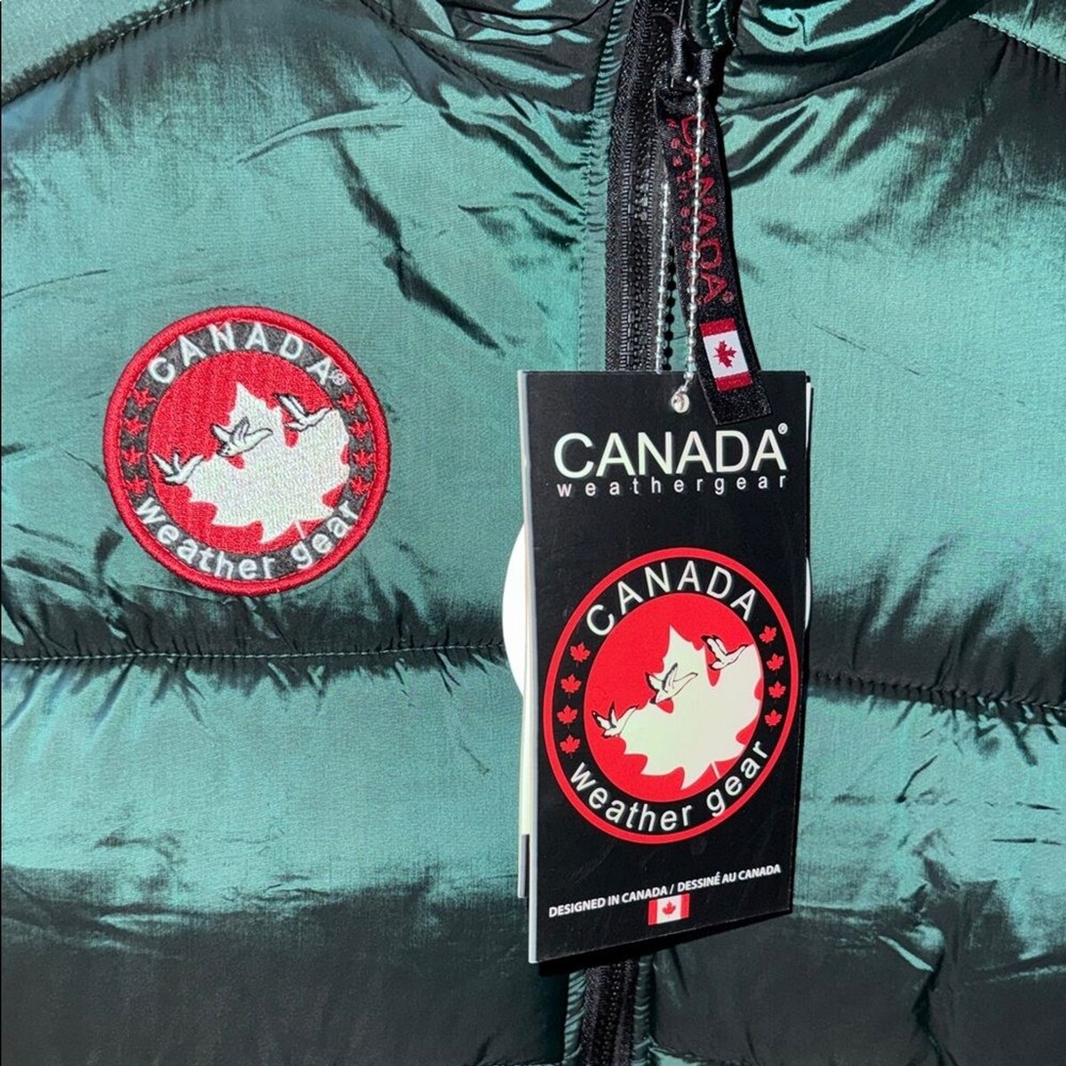 Shiny dark green zip-up puffer vest with attached hood. Features signature Canada Weather Gear patches. Zip side pockets. Adjustable hood toggle.