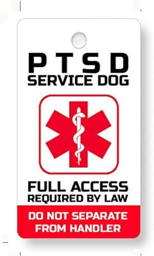 This PTSD Service Dog key or collar Tag will allow your service or working dog to enter restaurants, buildings, hospitals, shopping centers, hotels, cruise ships, grocery stores and even airplanes as per ADA laws
