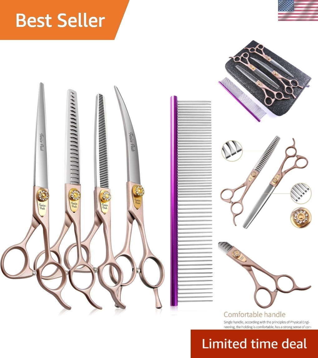 7?? Professional Dog Grooming Scissors Set Rose Gold 440C Stainless Steel Straight Thinning Curved Chunker Shears 4pcs Set for Pet Grooming Services Dogs and Cats