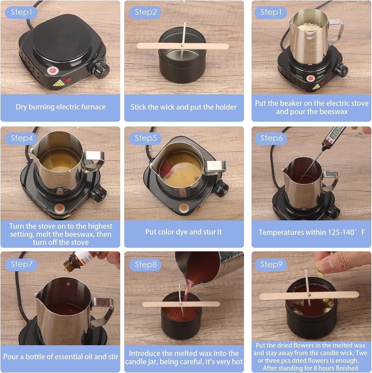?Super Easy to Make for beginners : Whether you are a beginner or a candle lover, this candle set allows you to easily make your own candles and enjoy the fun of making candles with your family. We have prepared a detailed guide with pictures to provide a foolproof candle making step. Tips: In order to avoid burning of dried flowers,there are two points to pay attention to: 1. Keep the dried flowers away from the wick when you place them in the melted Placing 2-3pcs dried flowers is enough.