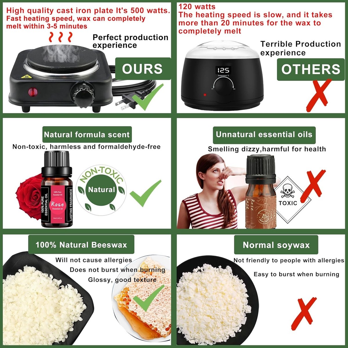 ?Advanced Wax Material: Our candle making kit is made of 100% natural wax, the candle will not be easily deformed, cracked or melted, it can burn cleanly for a long time and effectively release the smell. No need to worry about the unhealthy chemicals found in traditional paraffin wax, we only use plant-based additives that naturally exist in the environment.