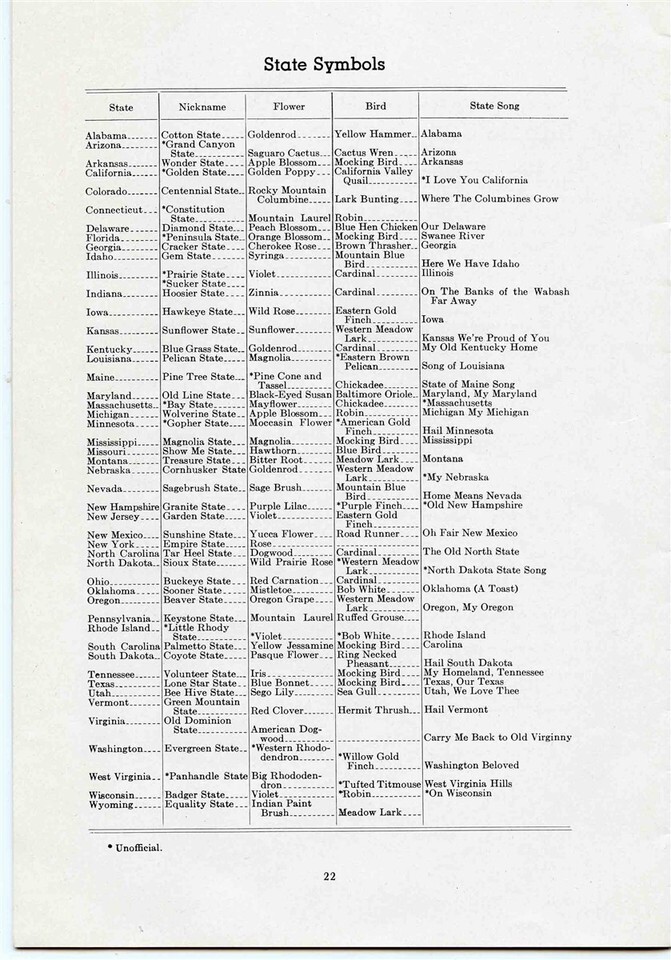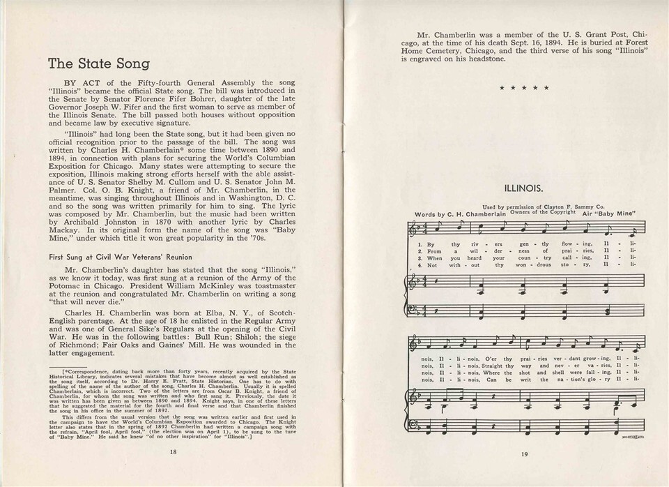 A 24 page booklet illustrated in black white and color. The Great Seal of Illinois Other Official State Symbols Booklet. Issued by Charles F Carpenter, Secretary of State. Includes information, history and images for the Great Seal, State Flag, State Tree and Flower, State Bird, State Song and Slogan. Has a page of the State Symbols of the other 48 states.