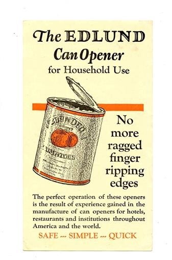 A small 2 sided single page advertisement. The Edlund Can Opener for Household Use Brochure. Includes the Edlund Junior and Table Attached Style.