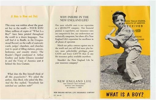 A 6 panel fold out brochure. What is a Boy Brochure, published by New England Life and copyright 1950