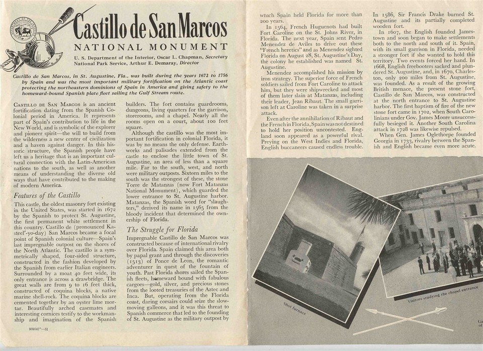 A large well illustrated 6 panel fold out brochure. Castillo de San Marcos National Monument Florida . Dated 1946. Has photos, history and more.