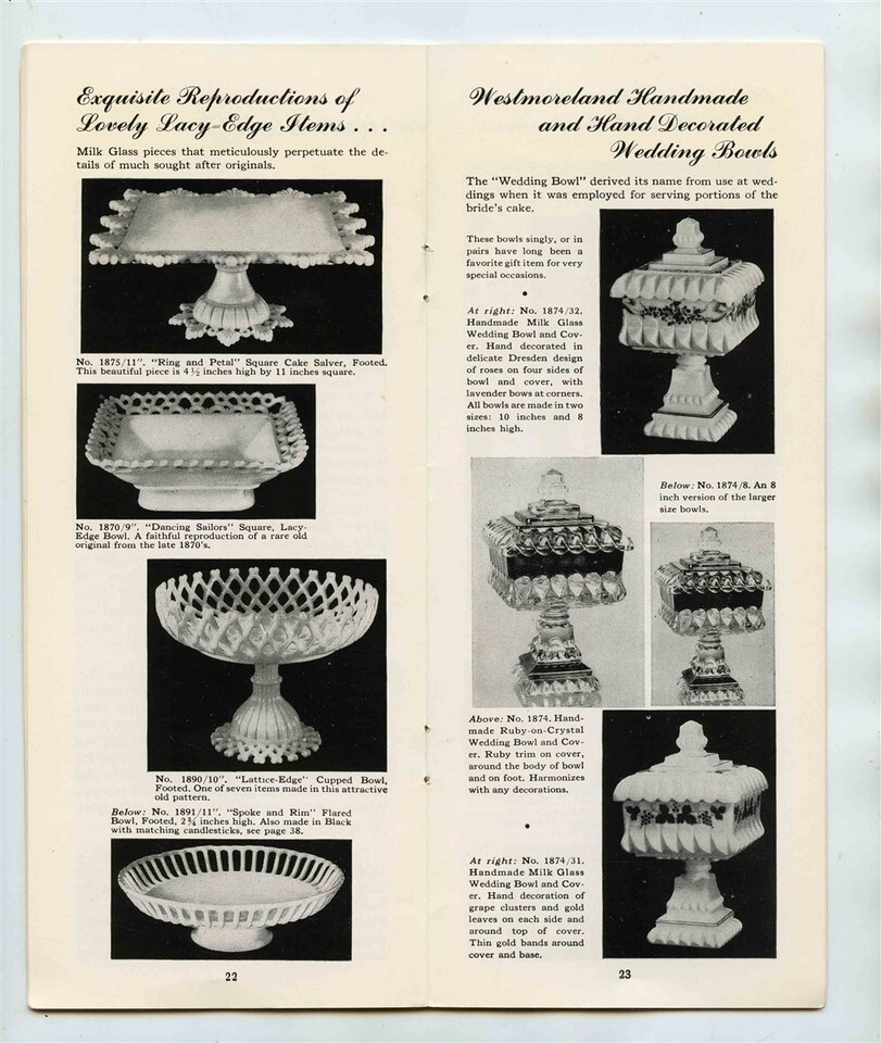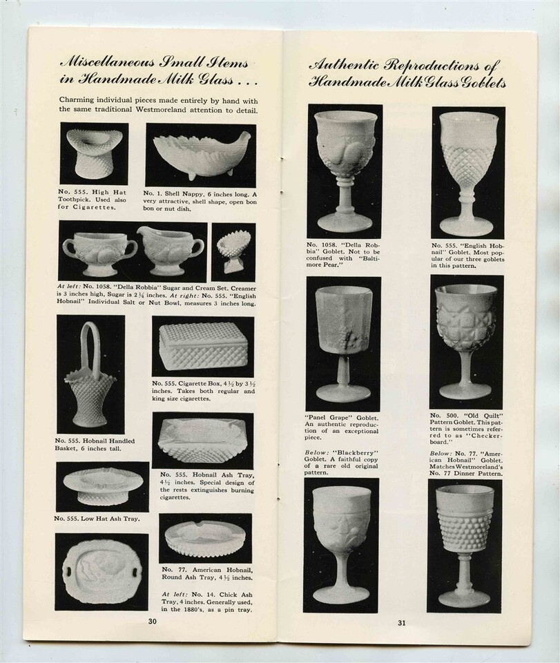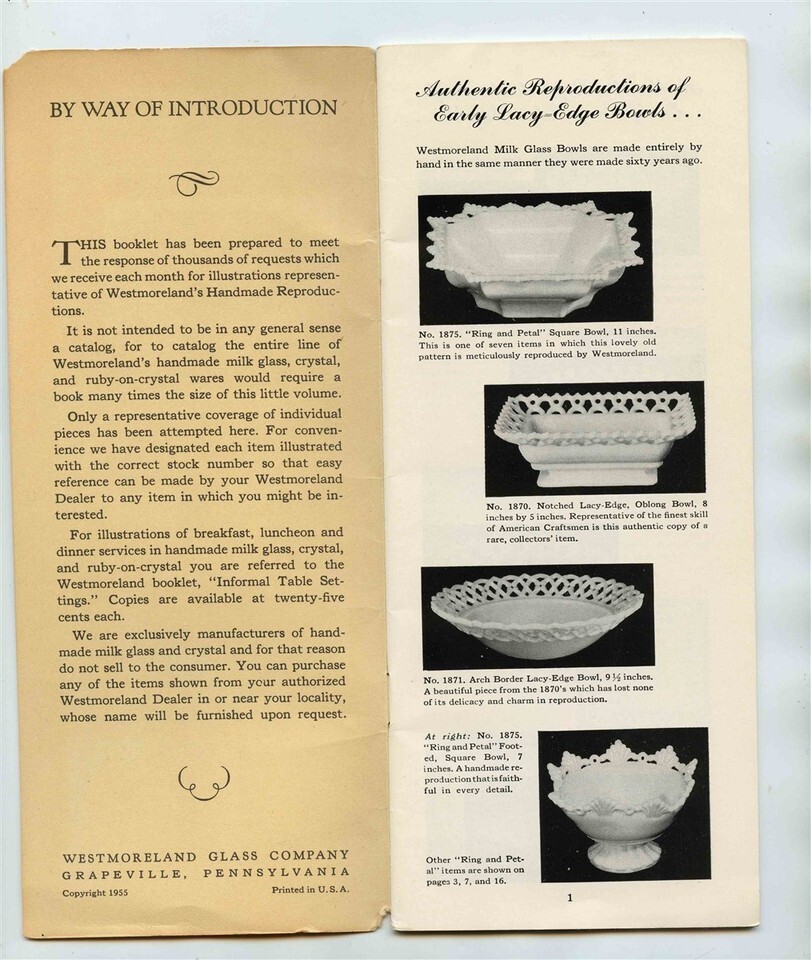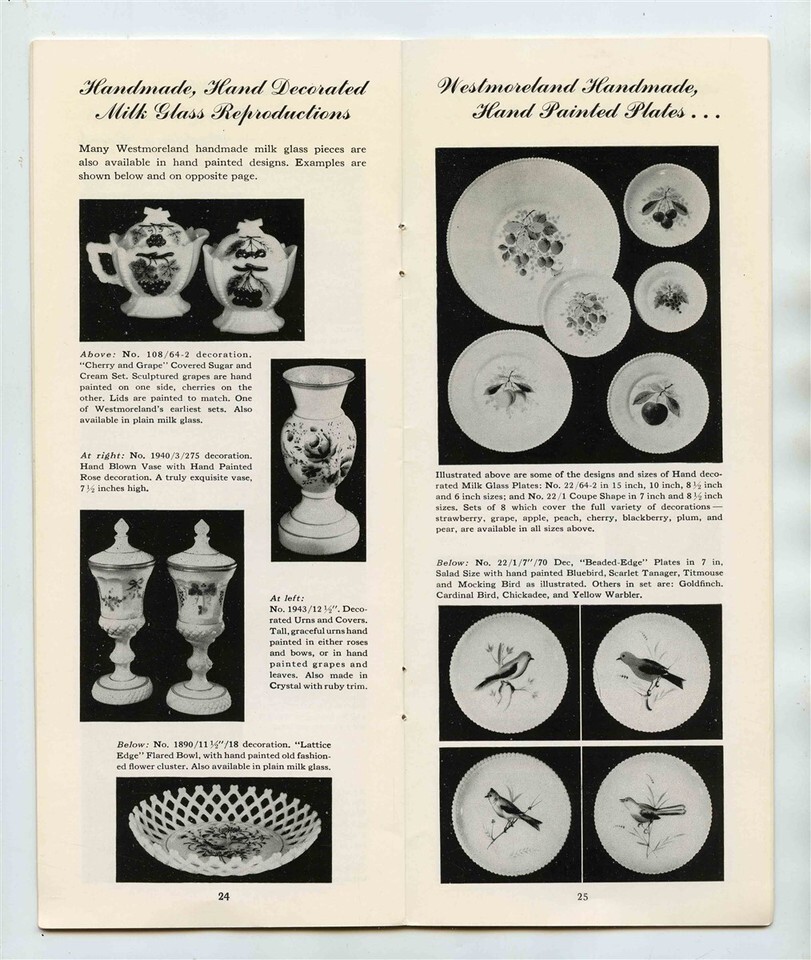 A well illustrated 39 page catalog. Westmoreland Glass Company Handmade Reproductions of Choice Pieces of Early American Glass Catalog. Dated 1955