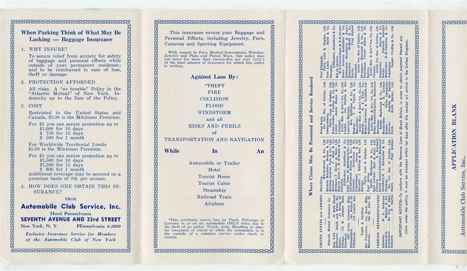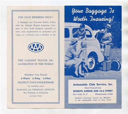 An 8 panel foldlout brochure with rates, information and more. Your Baggage is Worth Insuring AAA Brochure, Circa 1940's Automobile Club Service